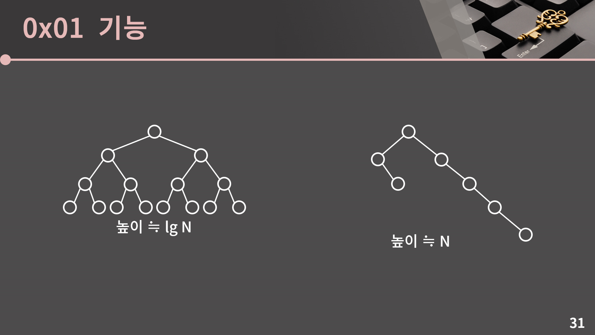 두 번째로 이진 검색 트리의 연산은 확인한 것 처럼 O(lg N)이 되는건 맞지만 같은 O(lg N)중에서도 상당히 느립니다. 저희가 지금까지 배운 알고리즘들 중에서 시간복잡도에 로그가 붙는걸 생각해보면 이분탐색이나 정렬 알고리즘을 떠올릴 수 있습니다. 이분탐색에서는 lg N번의 연산 동안 인덱스의 값만 왔다갔다하면 되지만 이진 검색 트리에서는 새로운 노드를 동적할당으로 생성하거나, 편향성을 해소해주기 위해 노드를 뗐다 붙였다 하거나 하는 식으로 다소 무거운 연산을 해야 할 일이 많습니다. 그렇기 때문에 이분탐색이나 정렬에서는 N = 100만이라고 할 때 N개의 데이터에서 이분 탐색을 N번 하거나 정렬을 해서 O(NlgN)짜리 연산을 수행한다고 하면 크게 부담스럽지 않게 통과가 되겠다 하고 짐작을 할 수 있는 반면 이진 검색 트리에서는 N = 100만일 때 N개의 데이터에서 연산을 N번 수행해야 한다고 하면 조금 부담이 됩니다. 상황에 따라 차이는 좀 있지만 보통 저런 상황에서 1초 제한이라고 하면 간당간당할 수가 있습니다. 그래서 이진 검색 트리는 O(lg N)이지만 좀 느리다는걸 기억해두면 좋습니다. 또 이진 검색 트리를 쓰는 문제인 것 같긴 한데, N = 100만과 같이 N이 좀 큰 상황에서 내가 생각한 풀이는 O(NlgN) 같고 시간 제한이 좀 넉넉하지 않은 상황을 마주한다면 STL set/map으로 풀었을 때 시간초과가 날 가능성도 있습니다. 이럴땐 일단 구현을 해보고 TLE가 난다면 기도하는 심정으로 STL unordered_set/unordered_map으로 교체해서 내보고, 그래도 또 TLE가 난다면 뭔가 set/map을 사용하지 않고 이분 탐색이나 정렬이나 아니면 그냥 배열의 인덱스를 가지고 푸는 다른 풀이를 고민을 해볼 필요가 있습니다.