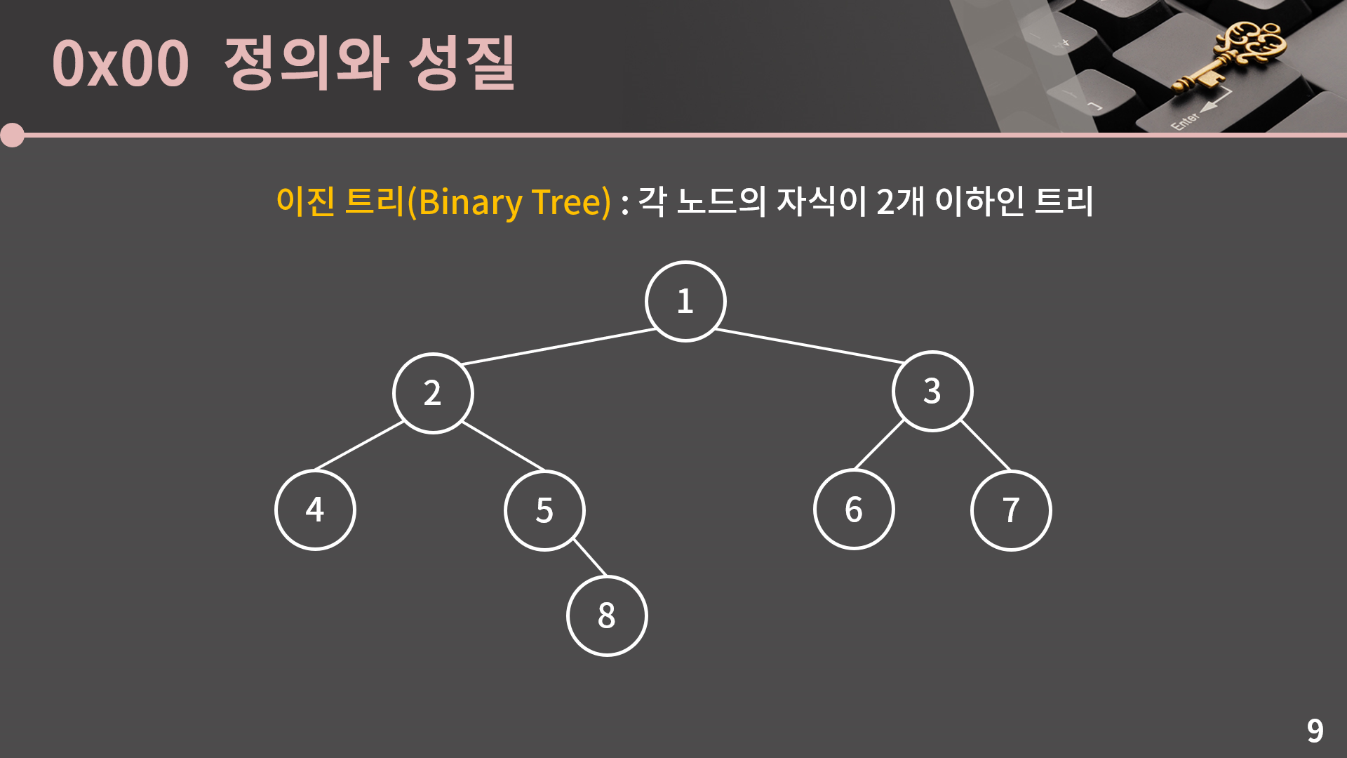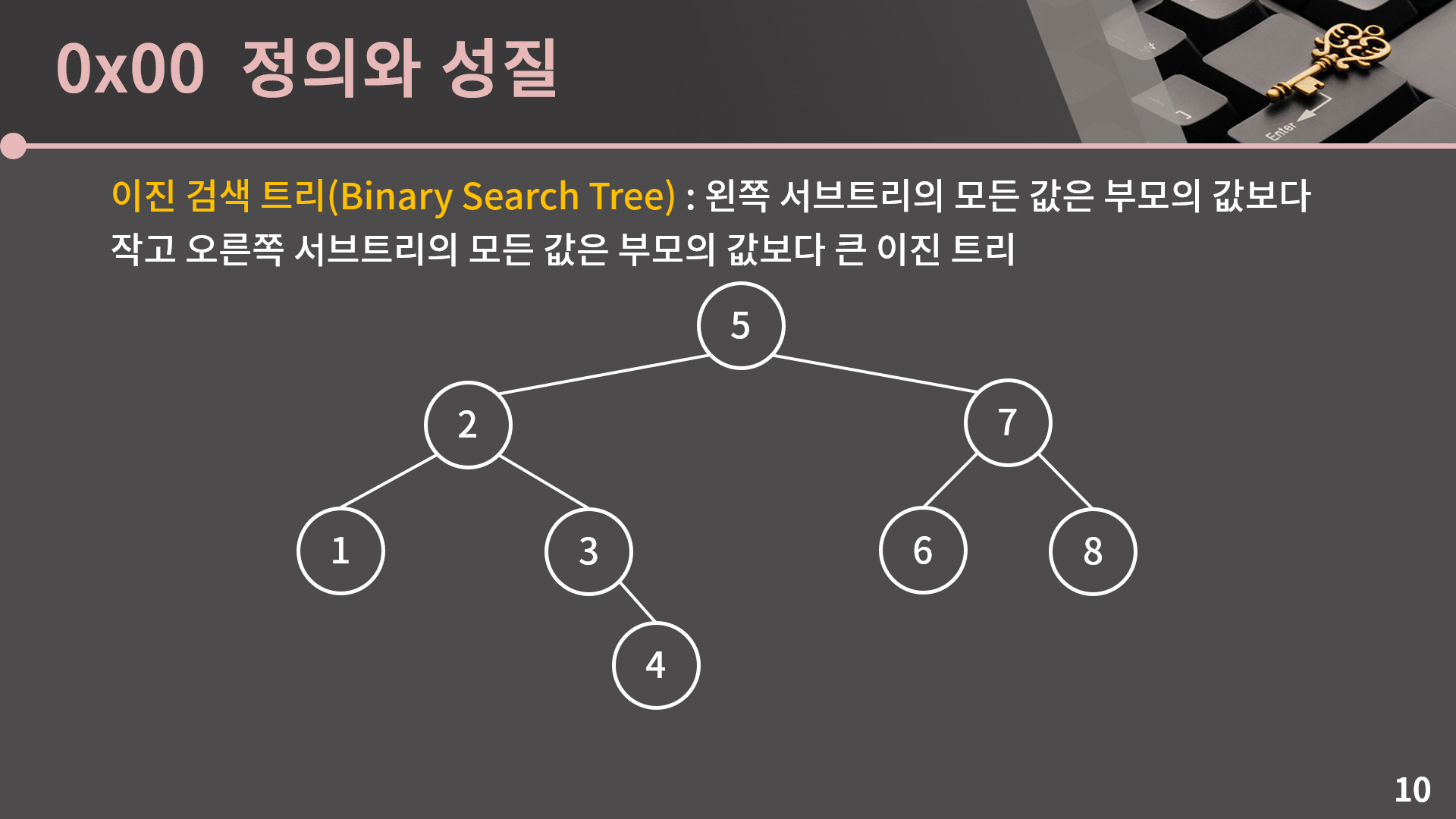 드디어 이진 검색 트리를 이해하기 위한 모든 과정이 끝났습니다. 왼쪽 서브트리의 모든 값은 부모의 값보다 작고 오른쪽 서브트리의 모든 값은 부모의 값보다 큰 이진 트리를 이진 검색 트리라고 합니다. 예를 들어서 값이 2인 정점을 보면 왼쪽 서브트리에 있는 1은 2보다 작고, 오른쪽 서브트리에 있는 3, 4는 2보다 큽니다. 값이 5인 정점도 살펴보면 왼쪽 서브트리에 있는 1, 2, 3, 4는 5보다 작고 오른쪽 서브트리에 있는 6, 7, 8은 5보다 큰걸 확인할 수 있습니다.