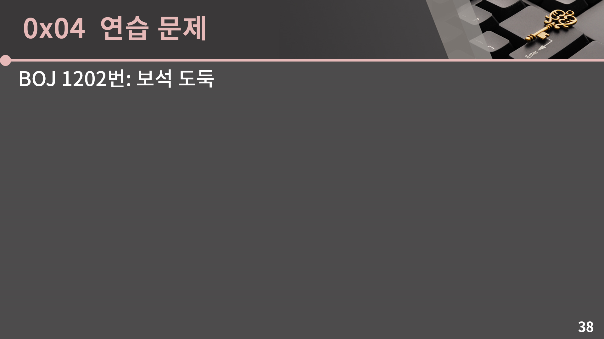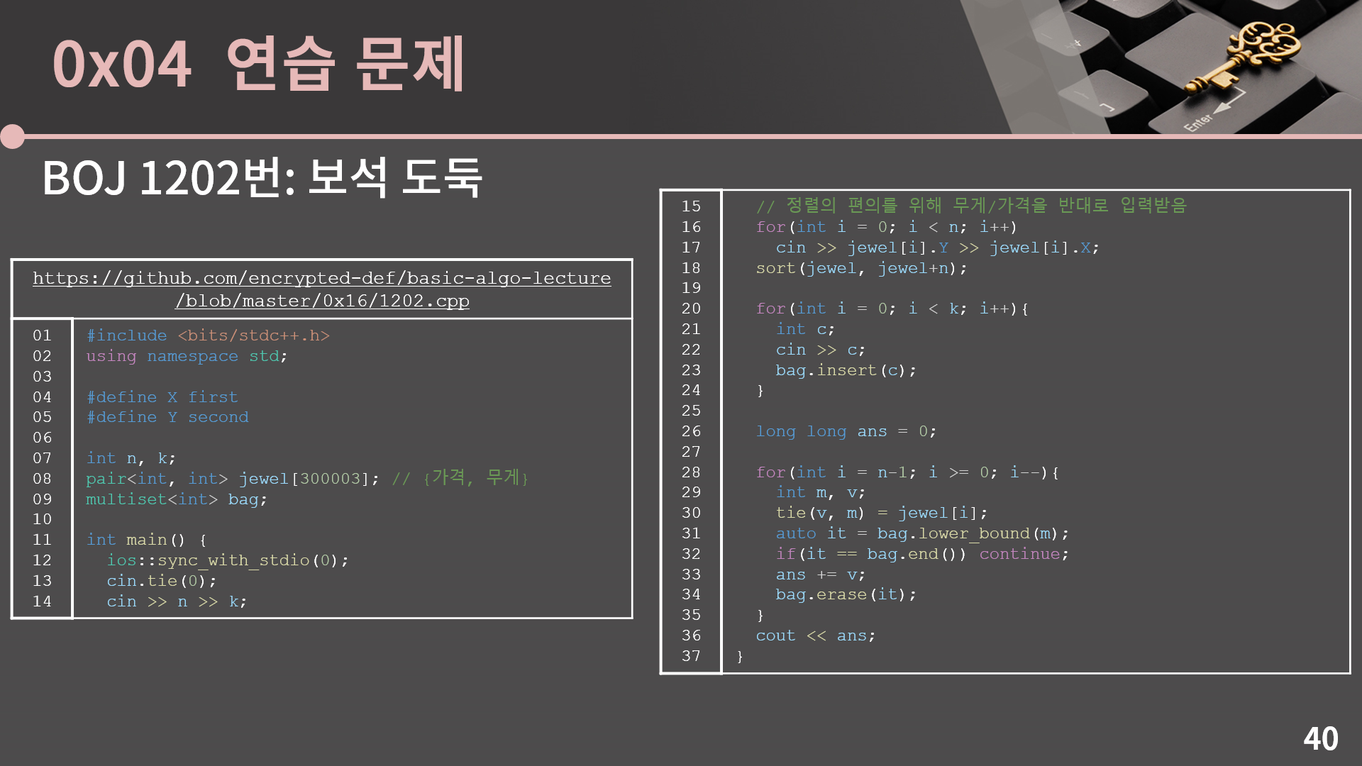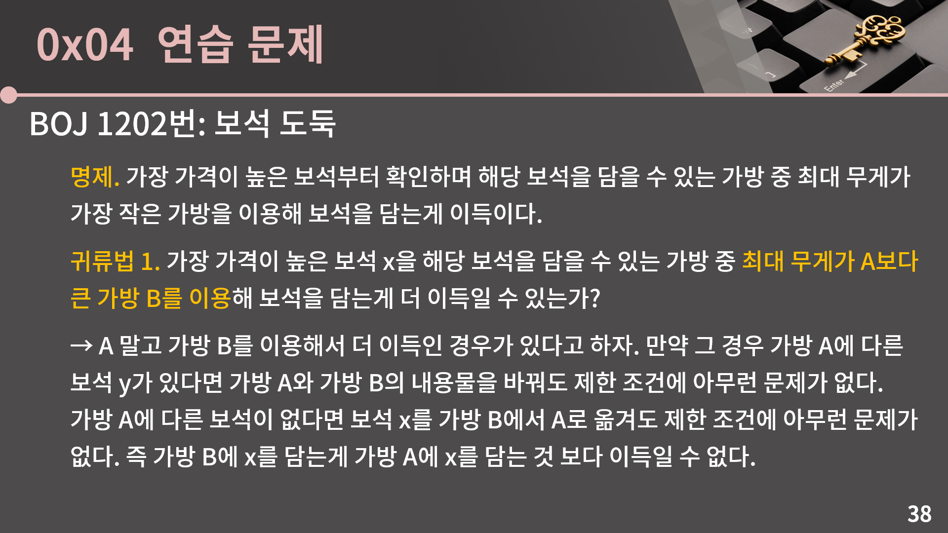 이건 어떻게 생각을 하면 되냐면, 또 마찬가지로 A에 안 넣는게 이득인 경우가 있다고 해보겠습니다. 그런 경우 가방 A에 다른 보석 y가 있다면 x가 가장 가격이 크다고 했으니 y 대신 x를 넣는게 더 이득입니다. 만약 가방 A에 다른 보석이 없다면 보석 x를 버리는 것 보다 A에 넣는게 더 이득입니다. 결론적으로 보석 x를 담지 않는게 가방 A에 x를 담는 것 보다 이득일 수 없습니다. 이렇게 정당성을 차근차근 따져본 결과 그리디 풀이가 맞다는걸 알 수 있었고 구현을 하면 되는데 구현을 딱 하려고 본 순간 뭔가 단순히 배열만 가지고는 해결이 안되는구나 하는걸 알 수 있습니다. 그냥 막 구현하면 O(NK)이고, 어떻게 시간복잡도를 좀 줄여보겠다고 보석을 가격 순으로 정렬하고 가방도 최대 무게 순으로 정렬하면 매 순간마다 해당 보석을 담을 수 있는 가방 중 최대 무게가 가장 작은 가방 자체는 이분 탐색으로 O(lg K)에 찾을 수 있지만, 문제는 이렇게 채워진 가방을 제거해야 합니다. 그런데 그냥 배열이면 제거가 O(K)여서 의미가 없습니다. 그래서 배열로는 어떻게 잘 안되고 대신 이진 검색 트리를 이용하면 해당 보석을 담을 수 있는 가방 중 최대 무게가 가장 작은 가방도 O(lg K)에 찾고, 가방의 제거도 O(lg K)에 할 수 있습니다. 바로 다음 슬라이드에 코드가 나오니까 구현을 해보고 넘어오도록 합시다.
