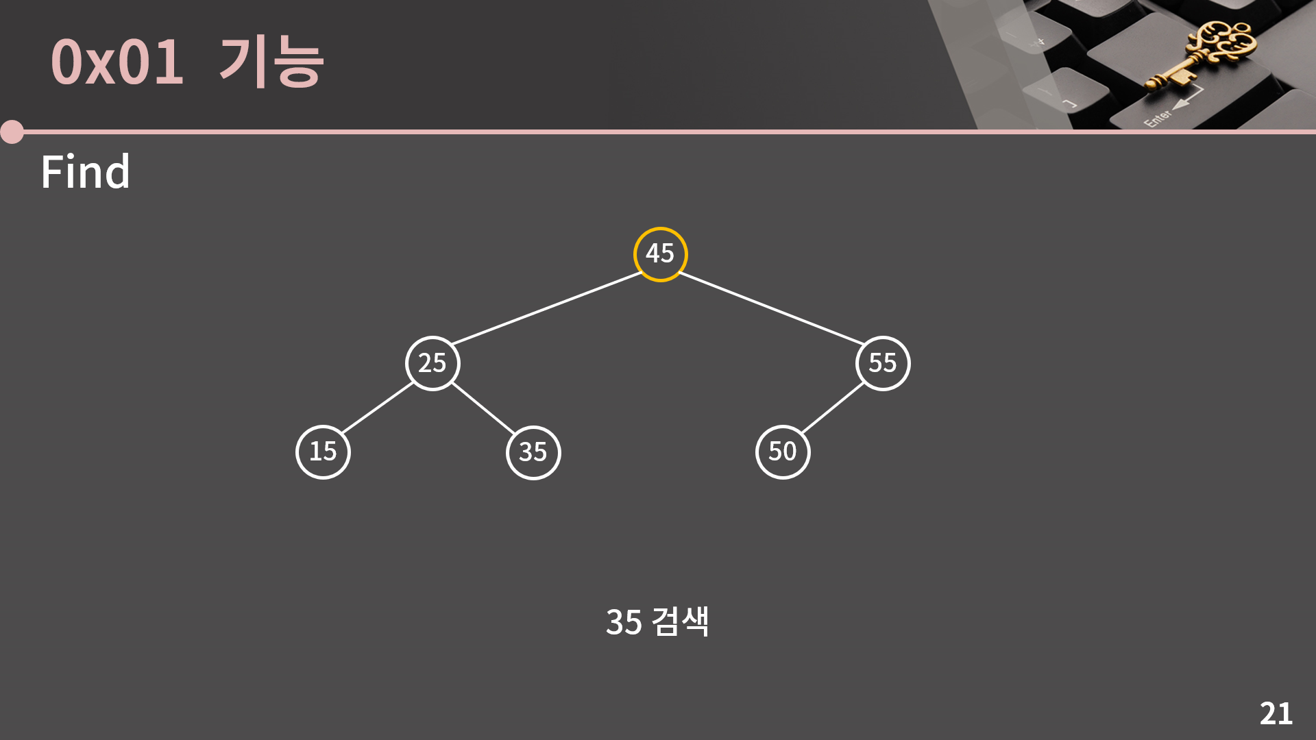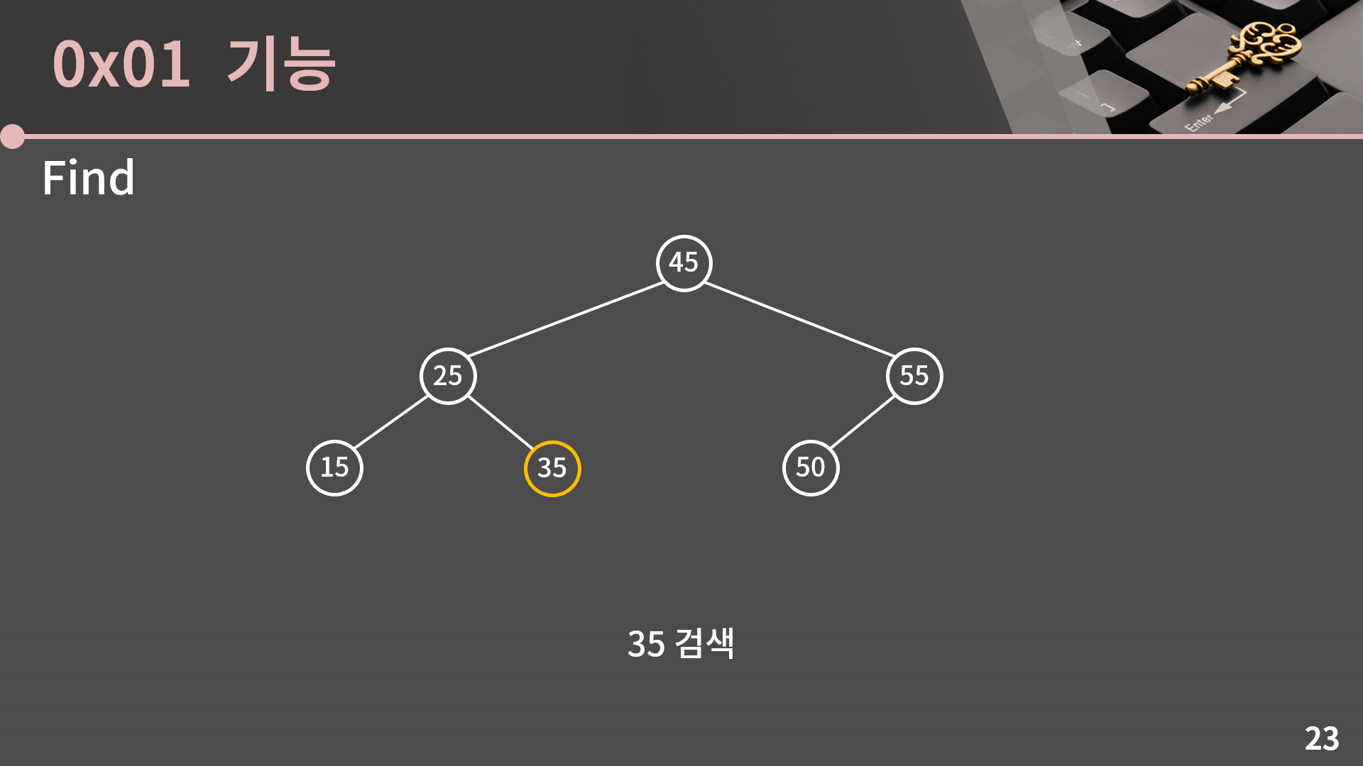 그 다음에는 오른쪽으로 가야 합니다. 지금 보고 있는 값이 딱 35가 되었기 때문에 찾는 과정이 끝납니다.