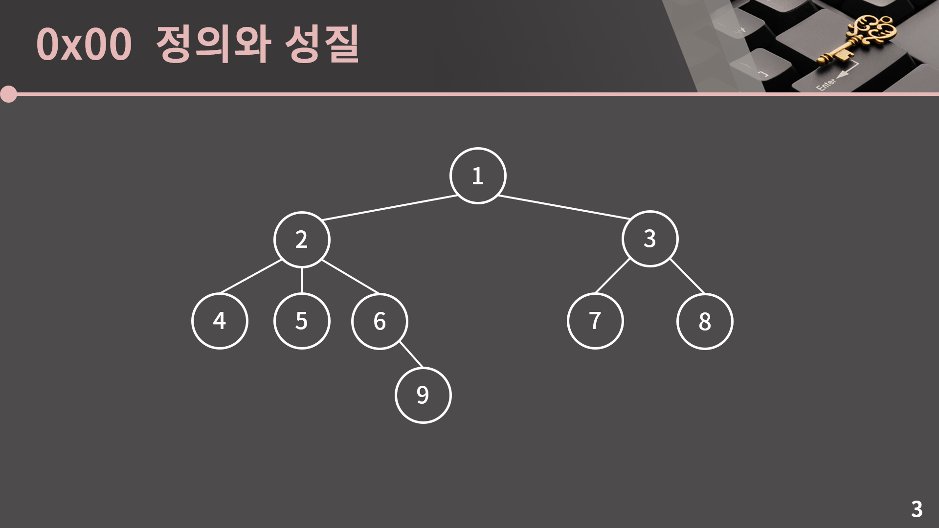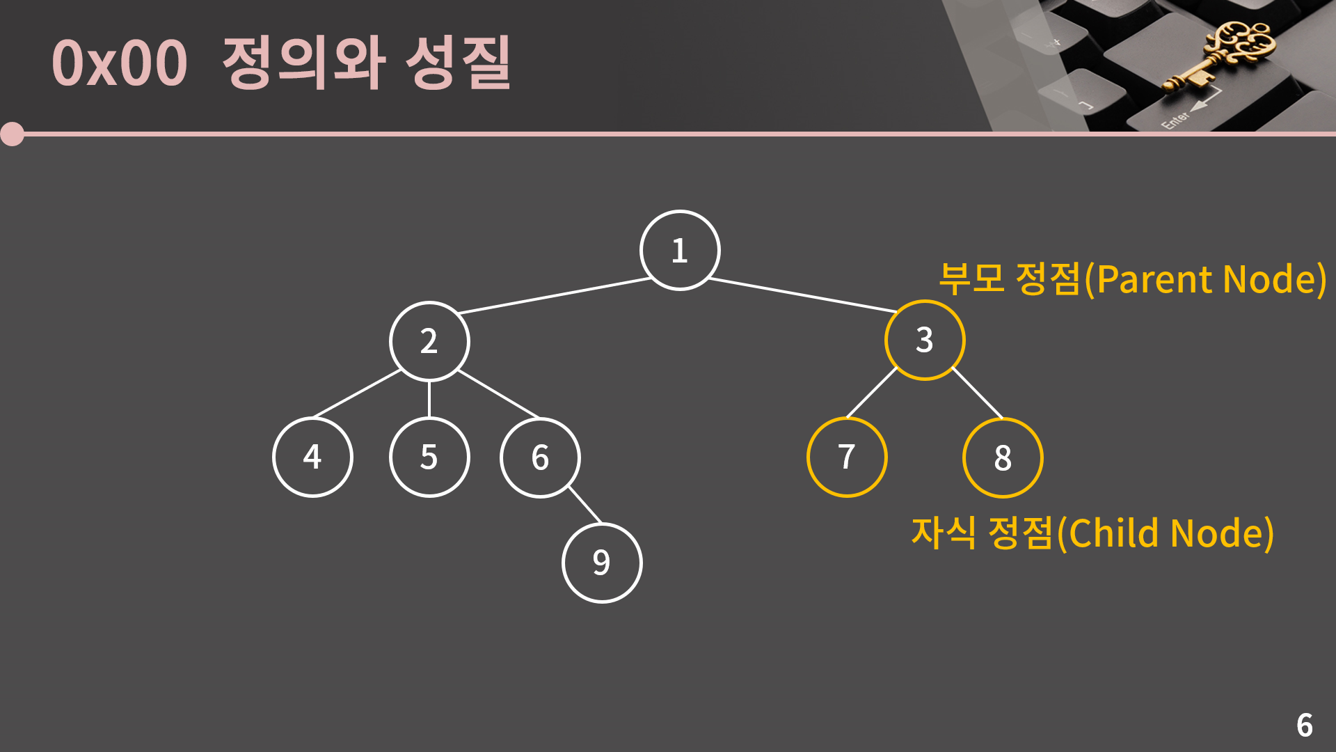 그리고 간선으로 연결된 위 아래의 관계를 부모 자식 관계라고 부릅니다. 예를 들어서 3번 정점은 7, 8번 정점의 부모 정점이고 7, 8번 정점은 3번 정점의 자식 정점입니다.