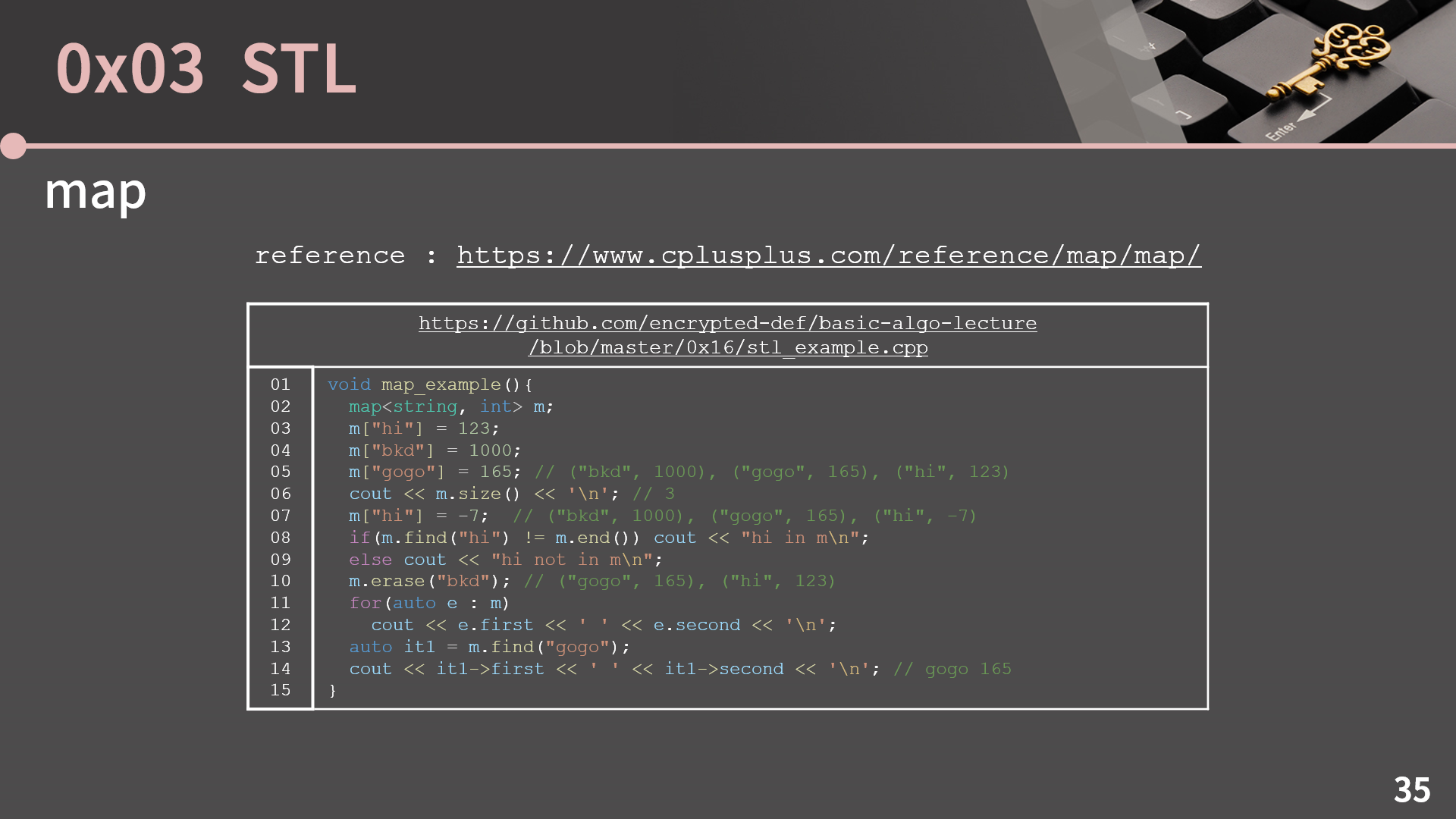 마지막은 map입니다. 이 친구도 key로 value를 찾는 인터페이스가 잘 되어있는 STL이고 이미 prev, next, lower_bound, upper_bound 이런건 앞에서 설명을 잘 했어서 14번째 줄만 한 번 보고 가겠습니다. it1이 가리키는 대상은 pair<string, int>이기 때문에 it1->first, it1->second로 key와 value를 가져올 수 있습니다.