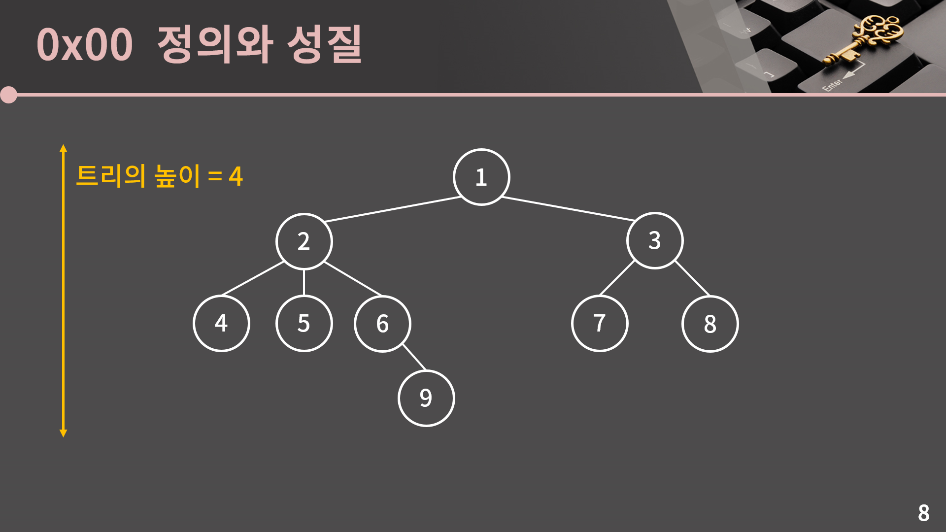 마지막으로 트리의 높이는 위 아래로 뻗어있는 정도를 나타냅니다. 노드가 1개만 있을 때의 높이를 1로 두느냐 0으로 두느냐에 따라서 주어진 트리의 높이가 3일 수도 있고 4일 수도 있긴 한데 크게 중요한 부분은 아닙니다.