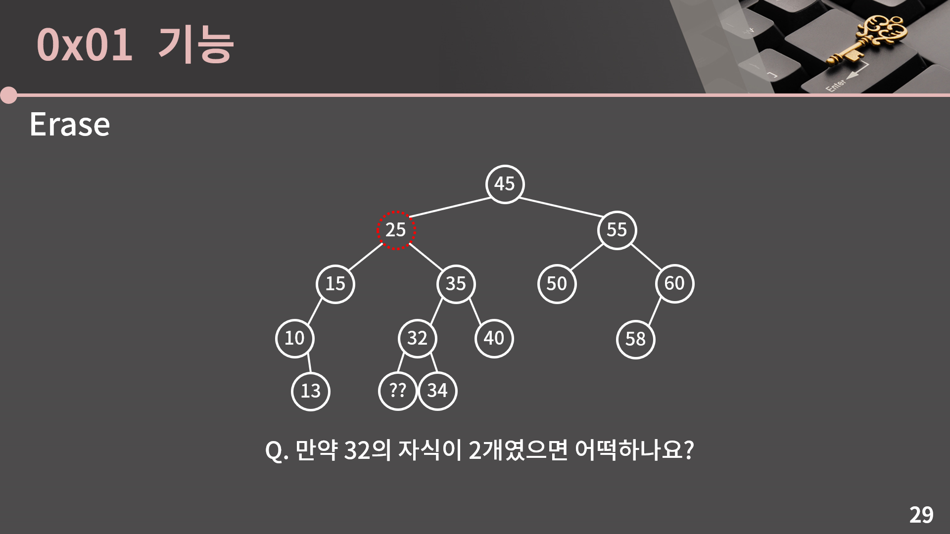 그런데 지금 32를 지우고 25로 옮기는게 별 문제 없었던 이유가 32의 자식이 1개여서였습니다. 만약 32의 자식이 2개였으면 32를 지우는게 또 복잡해질텐데 이런 경우에는 어떻게 해야할까요? 한 번 고민을 해봅시다.