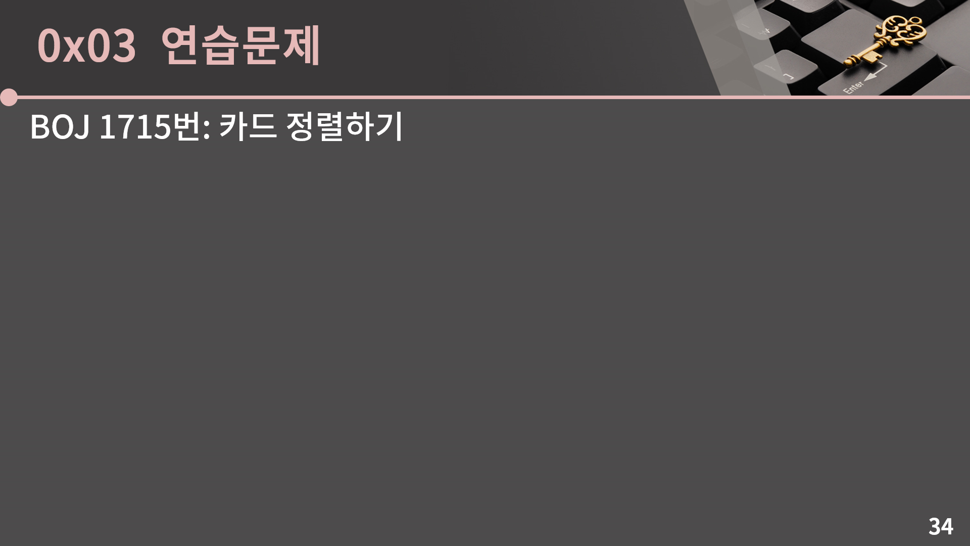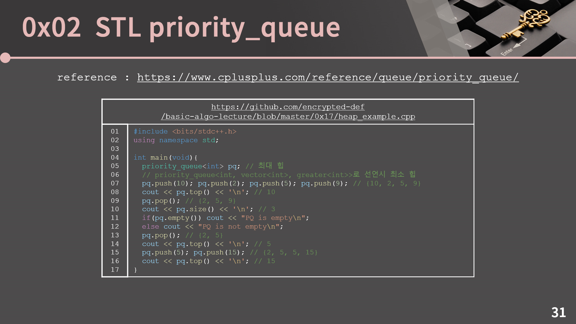 이렇게 우선순위 큐가 마무리됩니다. 굉장히 당연한 얘기일 수도 있지만 힙을 이용하면 N개의 원소를 삽입했다가 크기 순으로 빼는 방식으로 O(NlgN)에 N개의 원소를 정렬할 수 있습니다. 비록 정렬 단원에서는 아직 힙을 배우기 전이어서 힙 정렬을 소개해드리지 않았지만 힙을 배운 지금은 힙 정렬의 동작을 쉽게 이해할 수 있을 것 같습니다. 또 우선순위 큐는 엄청 특별한 응용 사례가 있다기 보다는 우선순위 큐에서 제공하는 기능이 곧이곧대로 필요한 상황이 있을 때 편하게 가져다 쓴다고 생각을 하면 됩니다. 그리고 무엇보다도 몇 단원 뒤에 배우게 될 다익스트라 알고리즘에서 우선순위 큐가 쓰이기 때문에 힙의 동작 원리를 아는 것도 중요하고 무엇보다도 STL을 좀 자유자재로 쓸 수 있는 연습을 해두시면 분명 도움이 됩니다. 그러면 다음 시간에 만납시다.