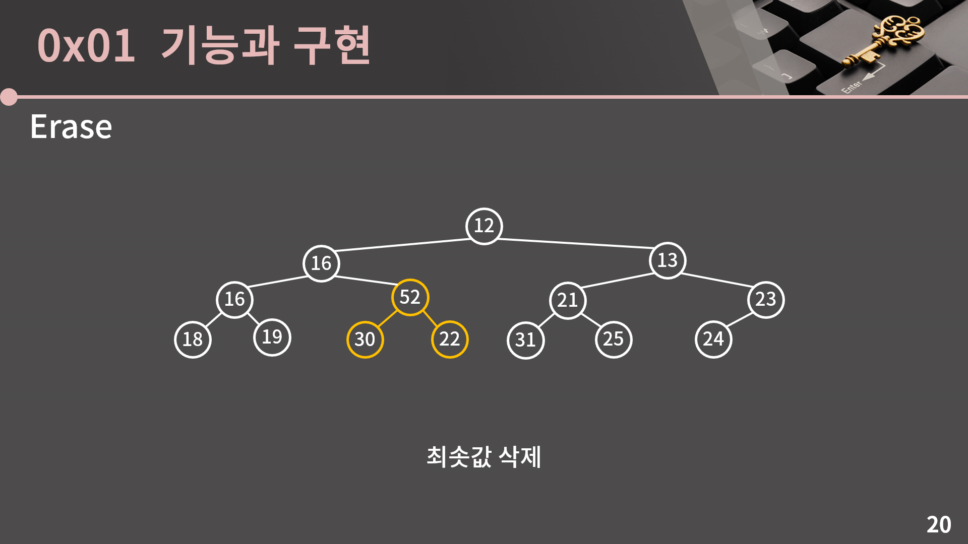 마지막으로 최솟값을 지우는 연산인데, 여기서 최솟값인 루트 8을 지우고 싶습니다. 그런데 그냥 무턱대고 지웠다가는 트리 구조가 깨질테니 뭔가 방법을 생각해야 합니다.