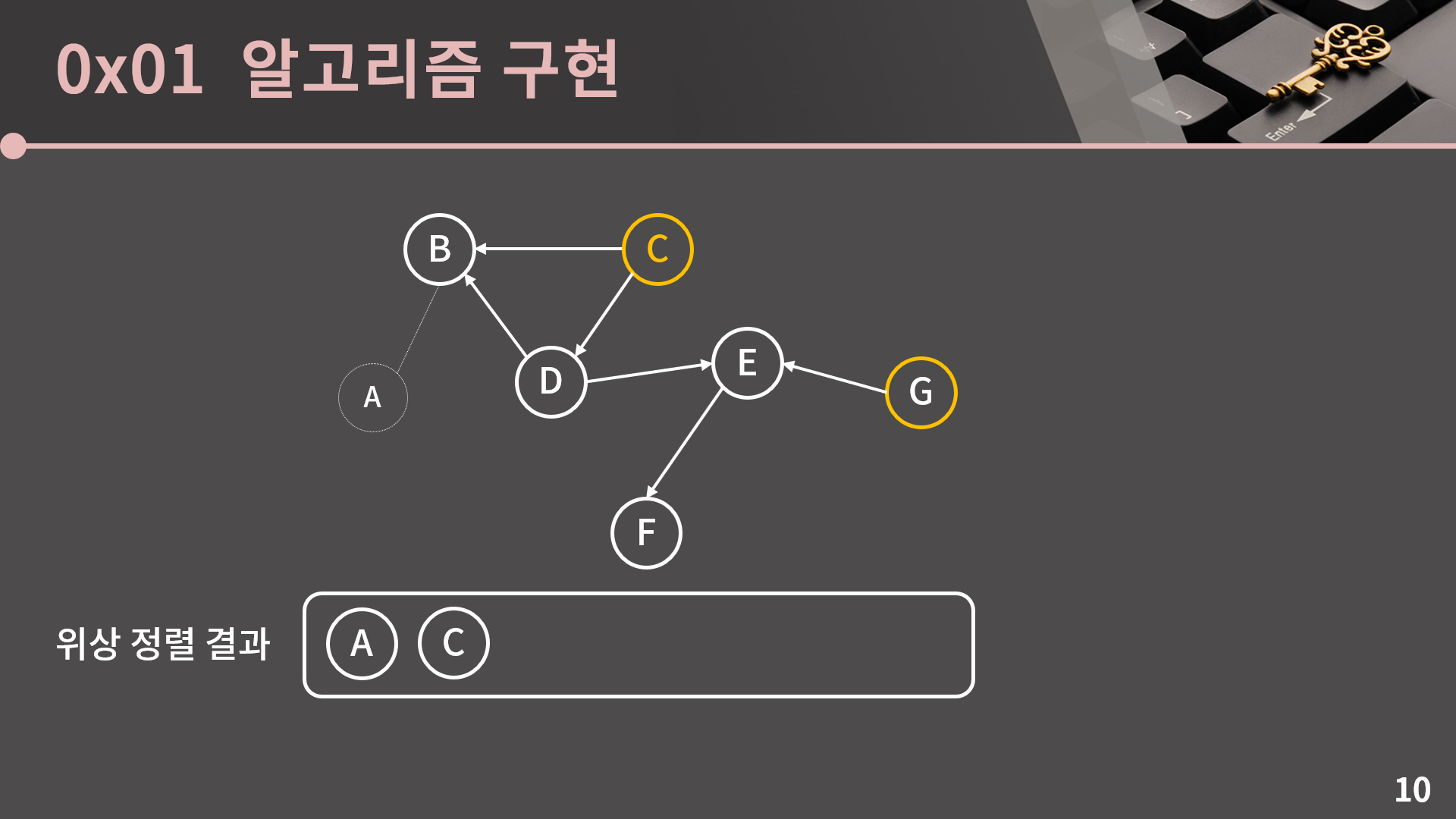 셋 중 어느 것이 제일 앞에 오더라도 전혀 상관이 없겠지만 임의로 A를 택하겠습니다. 그러면 위상 정렬에서의 첫 번째 정점은 A입니다.