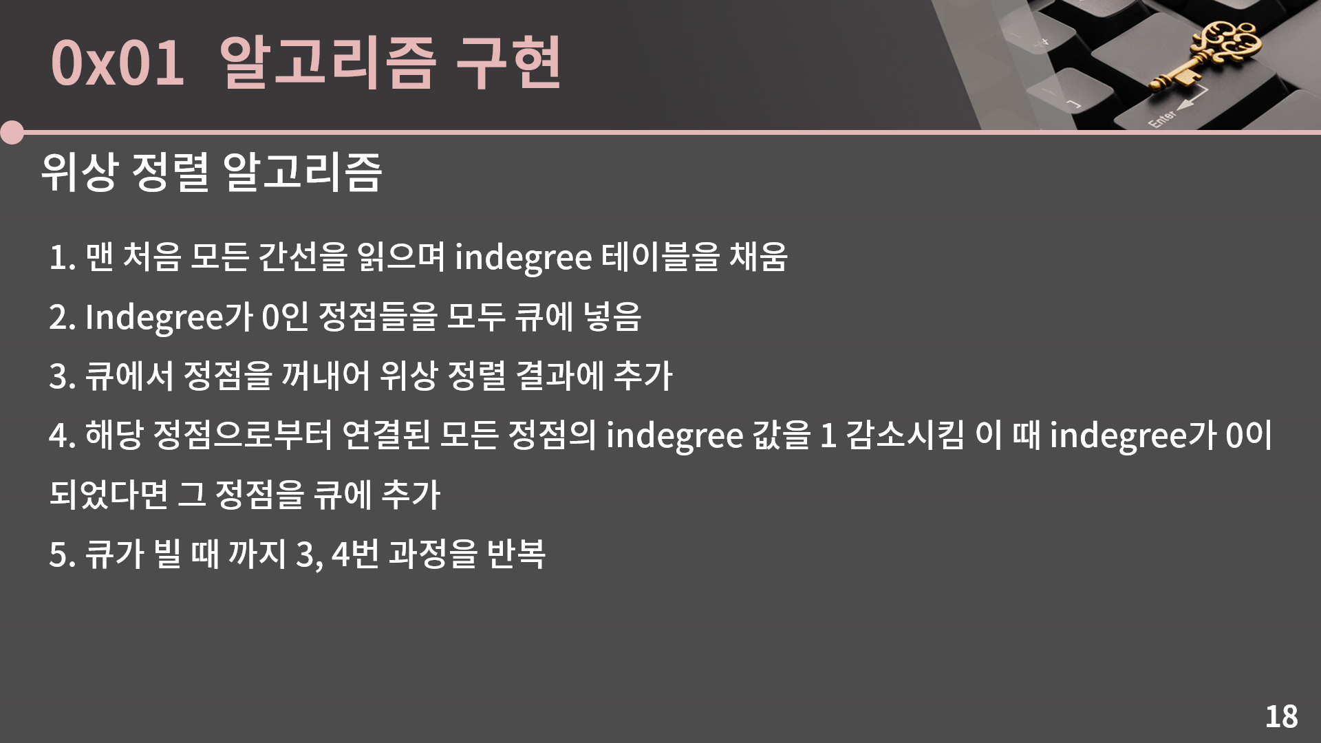 이제 저희는 사이클이 존재하지 않는 방향 그래프에서 해당 알고리즘이 늘 올바른 위상 정렬 결과를 내어준다고 믿고 계속 진행하겠습니다.