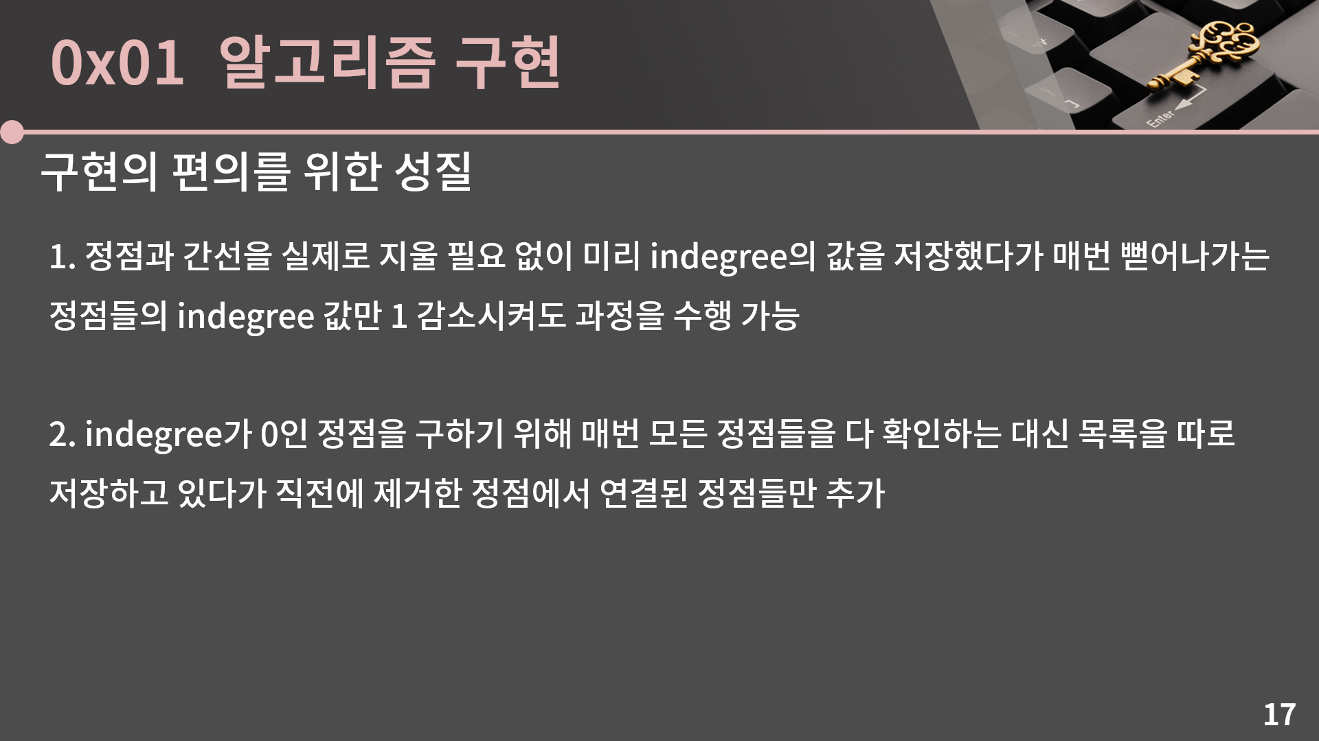 첫 번째로, 앞에서는 정점과 간선을 지웠지만 사실은 실제로 지울 필요 없이 미리 indegree의 값을 저장했다가 매번 뻗어나가는 정점들의 indegree 값만 1 감소시켜도 과정을 수행할 수 있습니다.