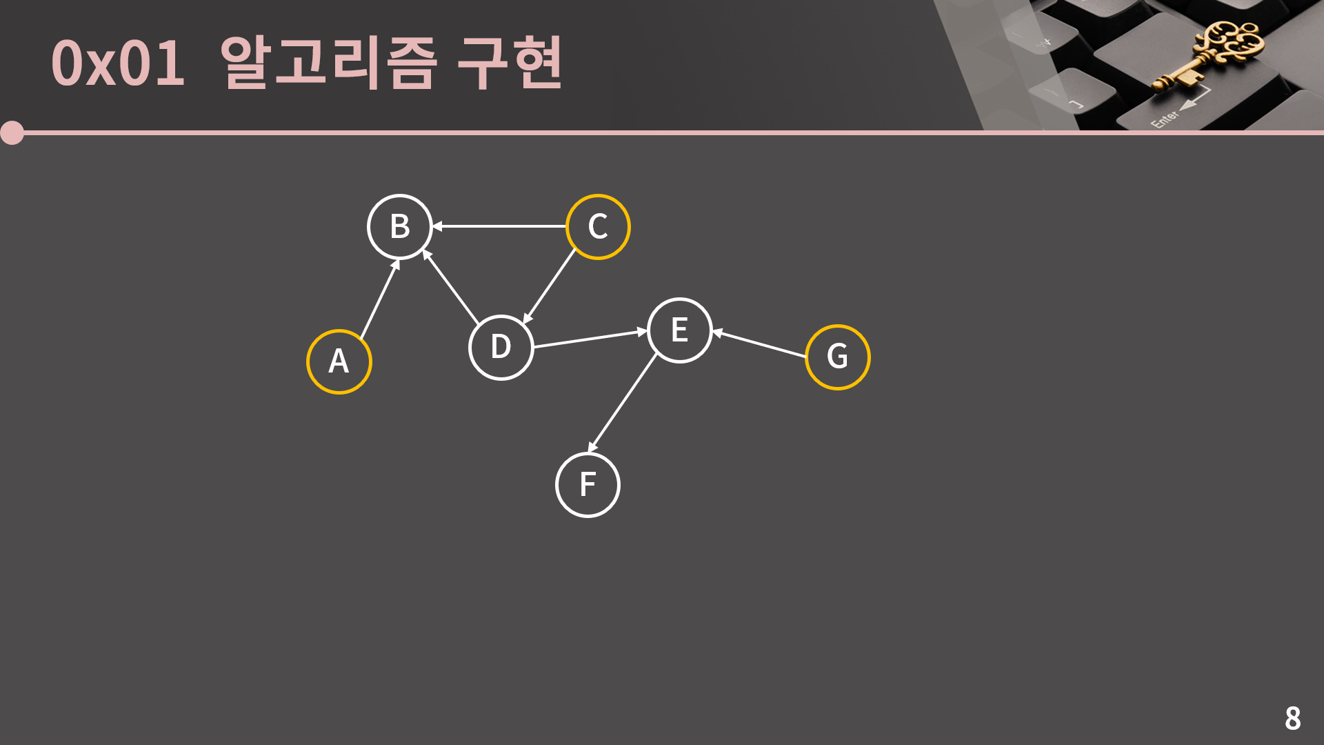 현재의 이 그래프에서 indegree가 0인 정점이 무엇인가 살펴보면 A, G, C가 가능한 후보군임을 알 수 있습니다.