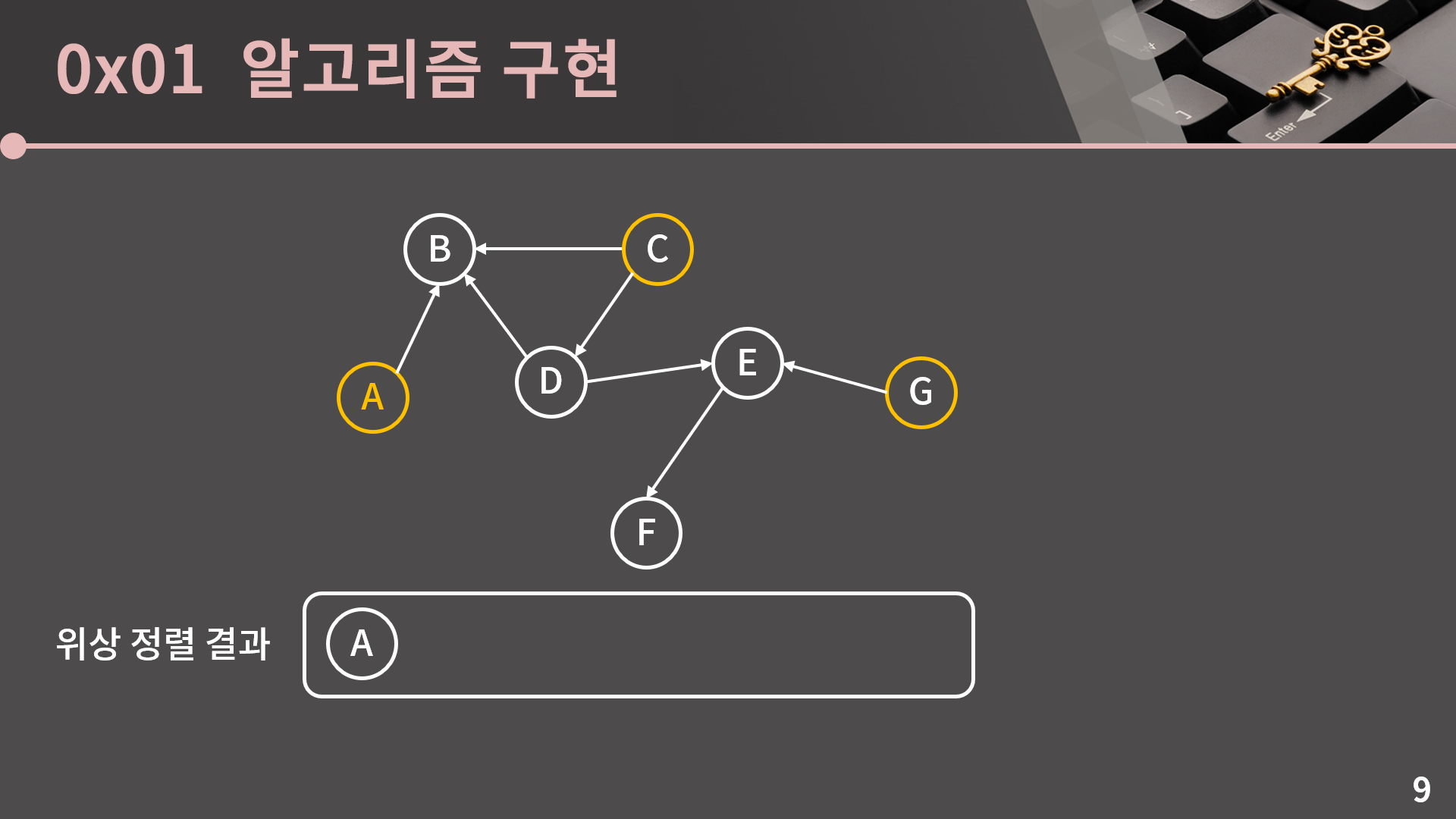 셋 중 어느 것이 제일 앞에 오더라도 전혀 상관이 없겠지만 임의로 A를 택하겠습니다. 그러면 위상 정렬에서의 첫 번째 정점은 A입니다.