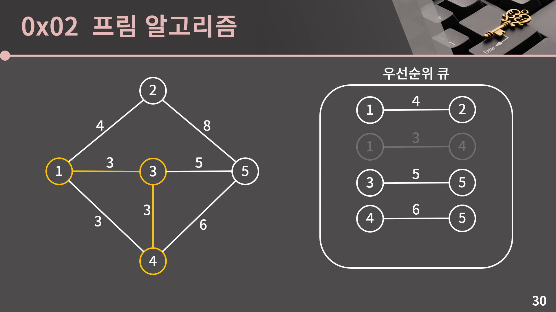1과 3을 연결하는 간선을 택했기 때문에 해당 간선과 3번 정점이 최소 신장 트리에 추가됩니다.