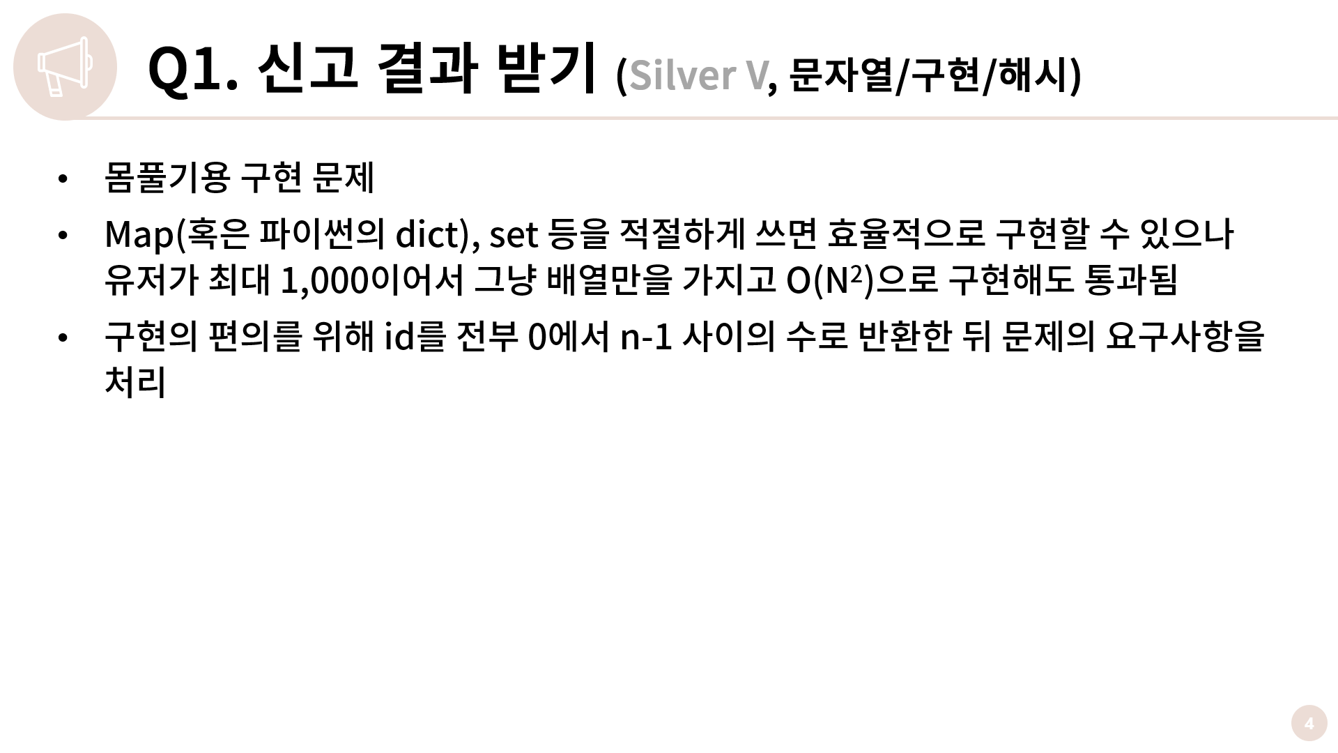 크게 설명할게 없는 몸풀기용 구현 문제입니다. Map(혹은 파이썬의 dict), set 등을 적절하게 쓰면 효율적으로 구현할 수 있으나 유저의 최대 수가 1,000이기 때문에 그냥 배열만을 가지고 O(N2)으로 구현해도 통과에 문제가 없습니다.