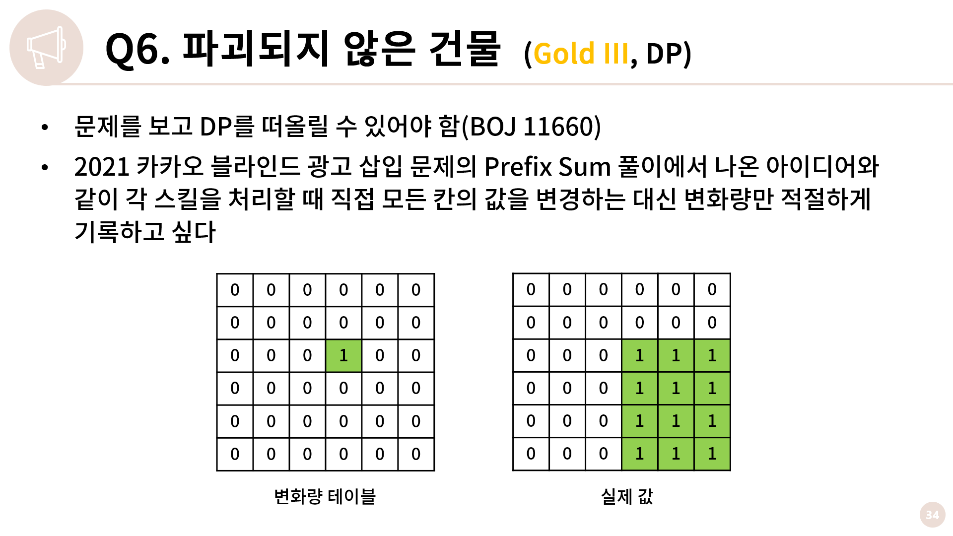 2021 카카오 블라인드 광고 삽입 문제의 Prefix Sum에서 소개해드린 아이디어처럼 각 스킬을 처리할 때 스킬이 적용되는 모든 칸의 값을 변경하는 대신에 변화량만 기록을 하고 싶습니다. 그림에 있는 것 처럼 변화량 테이블의 (3, 4)가 1이라는 의미는 (3, 4)의 오른쪽 혹은 아래에 있는 12칸의 값이 전부 1 더해져야 한다는 의미입니다.