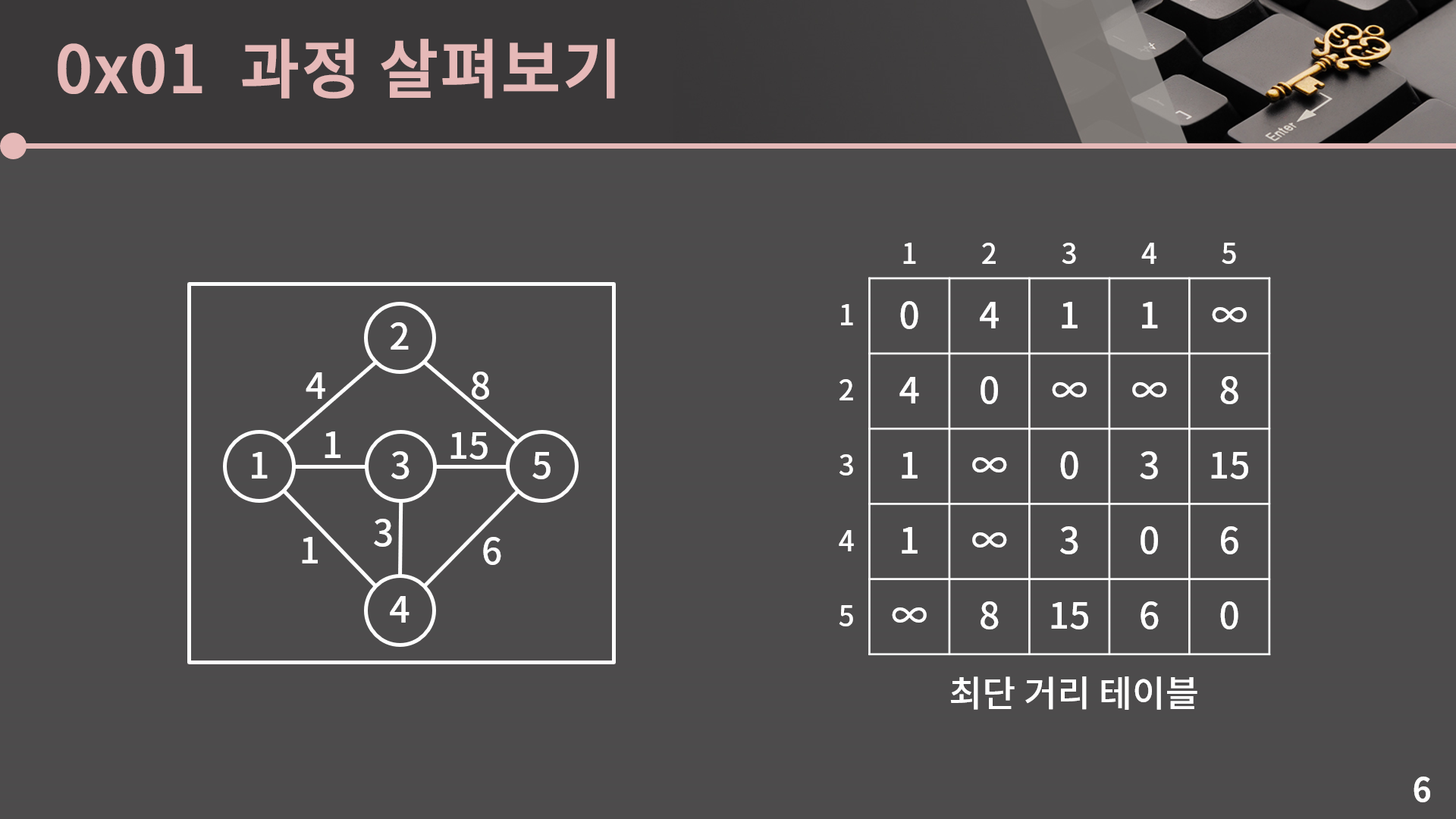 이제 대충 느낌이 오시나요? 현재 테이블에 적힌 값은 중간에 다른 정점을 거치지 않았거나 1, 2번 정점을 거쳐서 갈 때의 최단 거리입니다. 이것을 중간에 다른 정점을 거치지 않았거나 1, 2, 3번 정점을 거쳐서 갈 때의 최단 거리, 중간에 다른 정점을 거치지 않았거나 1, 2, 3, 4번 정점을 거쳐서 갈 때의 최단 거리, 마지막으로 중간에 다른 정점을 거치지 않았거나 1, 2, 3, 4, 5번 정점을 거쳐서 갈 때의 최단 거리 = 최종적인 최단 거리까지 쭉쭉 나아가면 됩니다.