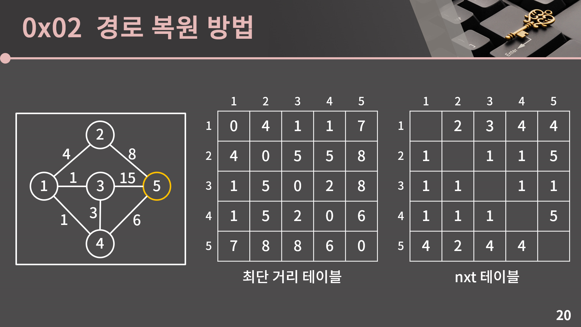 예를 들어 3에서 5로 가는 최단 거리가 8인건 알겠는데, 3, 1, 4, 5 순으로 가야한다는 사실을 알 수는 없습니다.