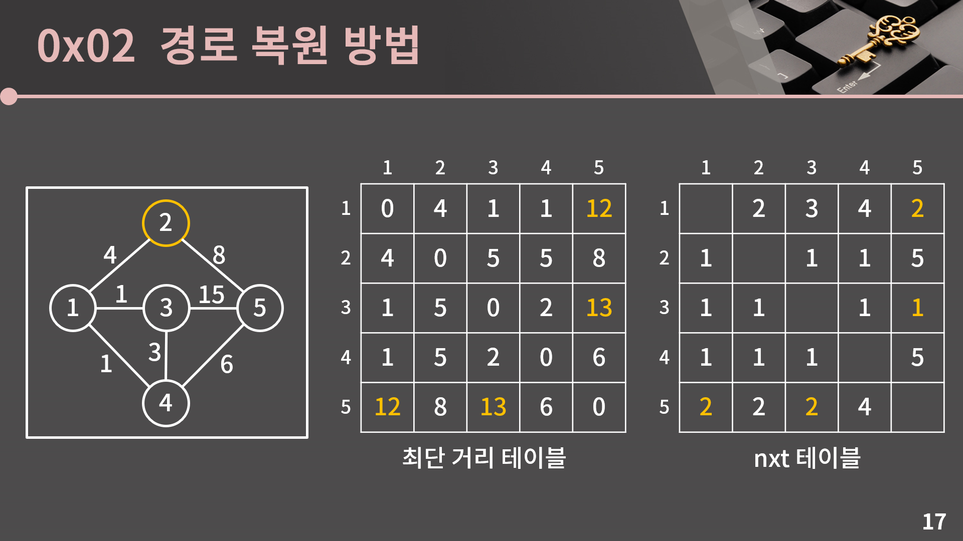 a에서 b까지 최단 거리로 가는 전체 경로를 다 복원하려고 들지 말고 딱 한 단계만 해봅시다. a에서 b까지 최단 거리로 가려면 a에서 어느 정점으로 가야 하는지만 생각해봅시다. 이를 nxt 테이블이라고 부르겠습니다.