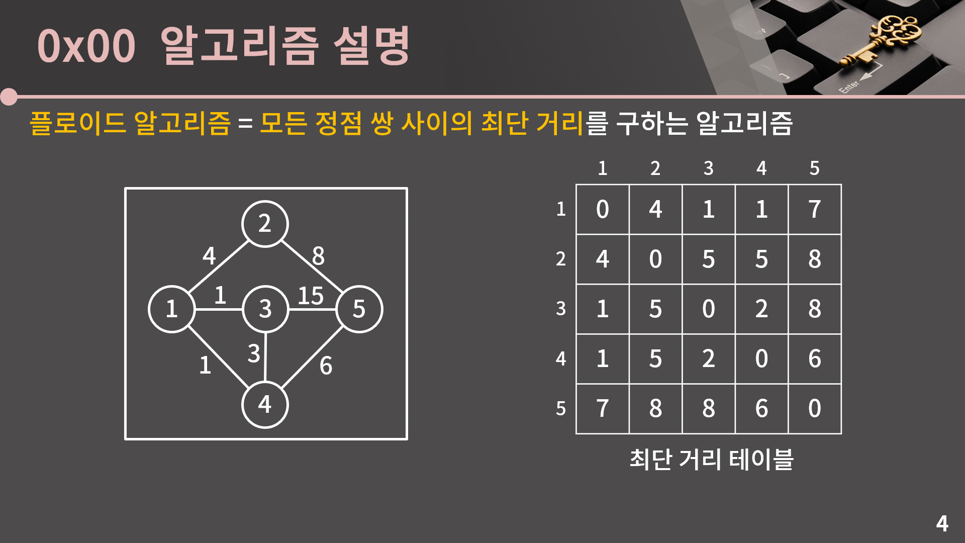 다만 다행히 플로이드 알고리즘은 구현이 아주 쉬운 편에 속합니다. 그렇기에 이전 강에서 높은 구현 난이도에 고통받았다면 이번에는 조금이나마 더 편한 마음으로 강의를 들을 수 있지 않을까 싶습니다.