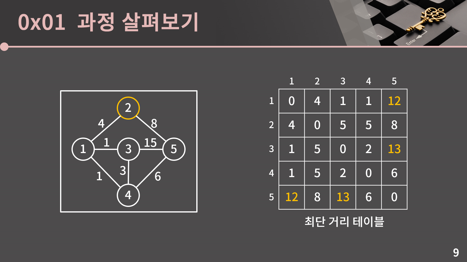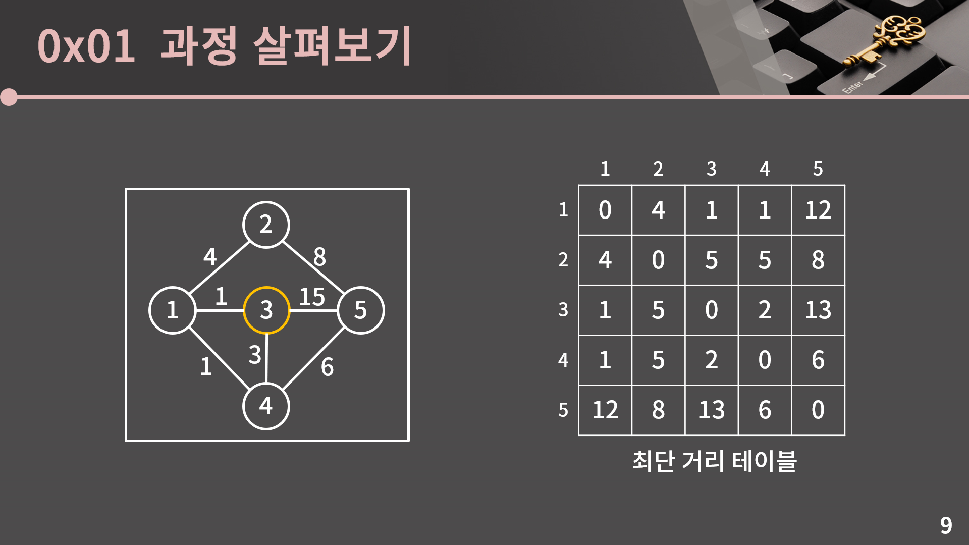 이러한 상황에서 이 플로이드 알고리즘은 아주 기발한 접근법을 제시합니다. 그 접근법이란 바로 현재 테이블에서 일단 1번을 거쳐가는 최단 거리만을 먼저 갱신하는 방법입니다.