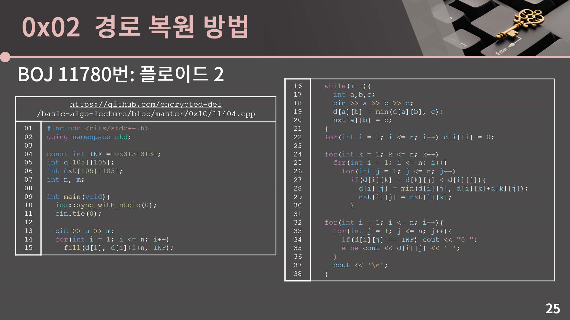 3중 for문이 돌아가는 형태는 21-24번째 줄과 같습니다. 저는 플로이드 알고리즘을 구현할 때 3중 for문의 값을 k, i, j로 두고 i를 시작점, j를 끝점으로 생각하는 것을 선호합니다. 변수의 이름을 꼭 저와 같이 붙일 필요는 없지만 테이블을 갱신할 때 중간에 거쳐가게끔 할 원소를 3중 for문의 제일 바깥에 두어야한다는건 꼭 기억하셔야 합니다. 저기서 i, j, k의 순서가 바뀌었다고 할 때 작은 예제에서는 답이 맞는데 제출하면 틀리는 일이 아주 잘 발생해서 틀린 원인을 찾을 때 애를 먹는 경우가 종종 있습니다. (코드)