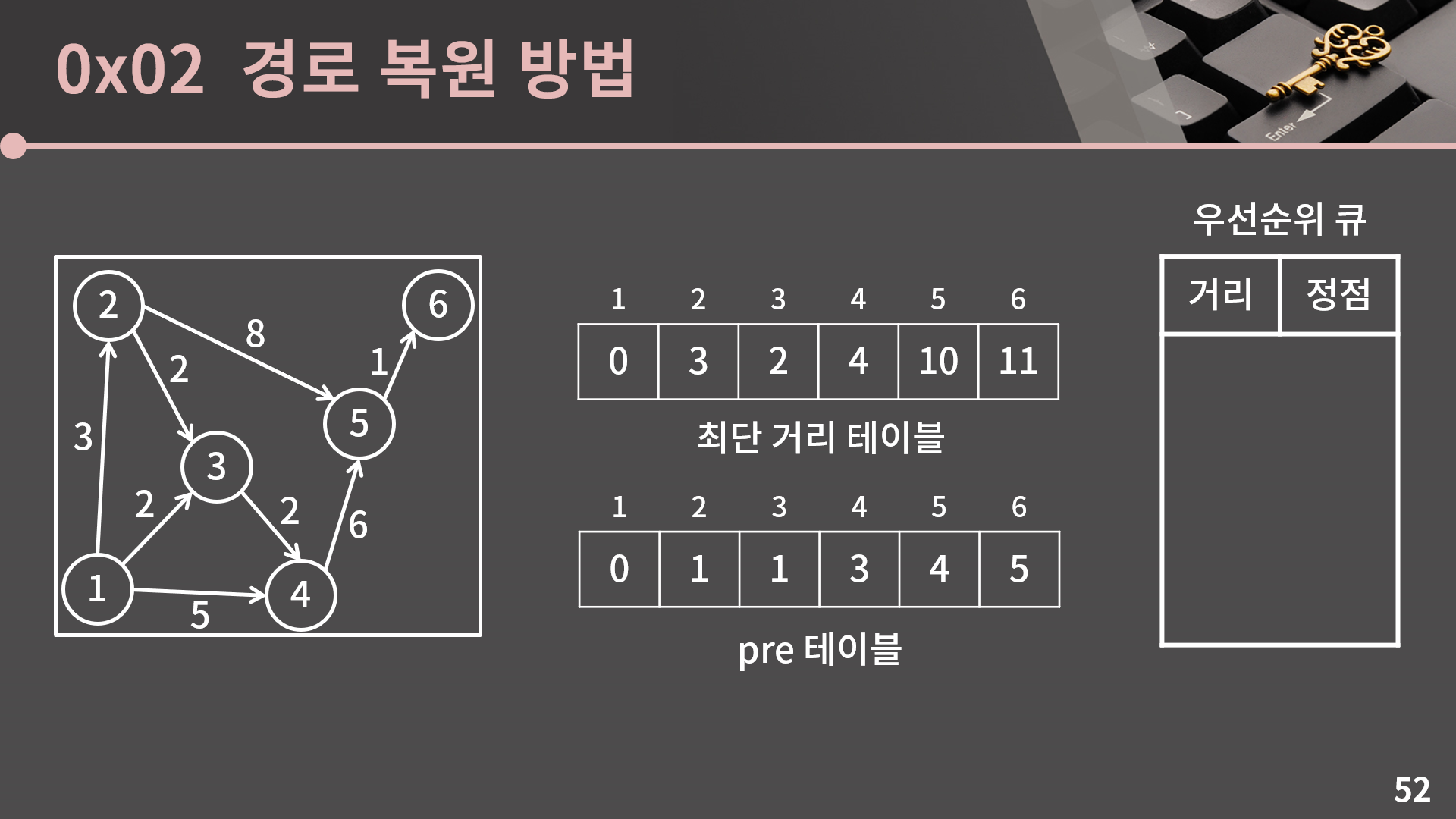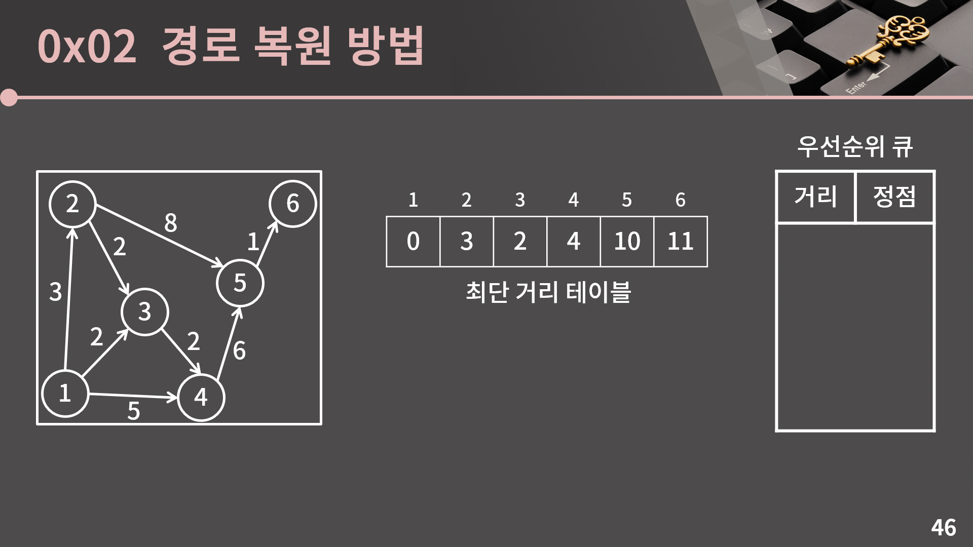 다음으로 경로 복원 방법을 알아보겠습니다. 현재 저희는 최단 거리만 알고 있지 실제로 어떤 경로로 가야 하는지는 모릅니다. 그리고 플로이드 알고리즘처럼 다익스트라 알고리즘에서도 경로 복원이 가능합니다. 플로이드 알고리즘에서 이미 한 번 살펴봤기 때문에 충분히 혼자 힘으로 떠올릴만 합니다. 고민을 해봅시다.
