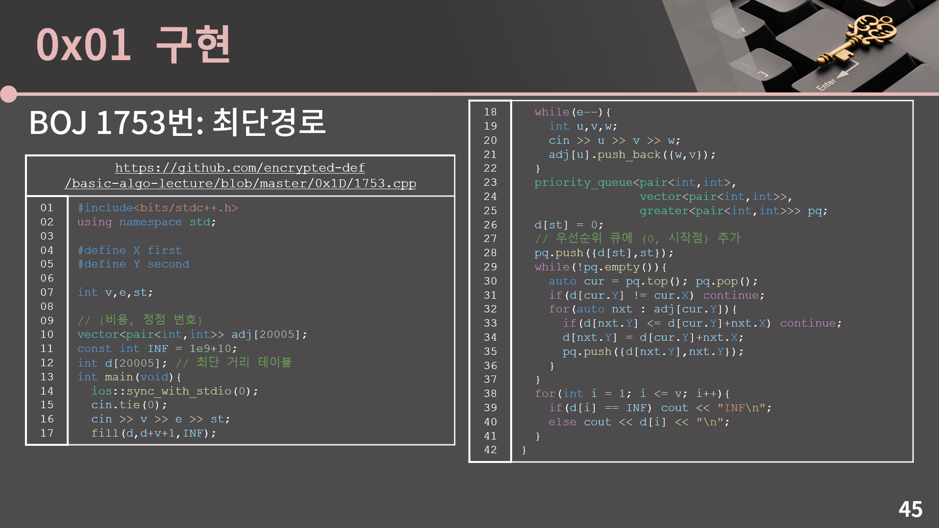 구현은 그냥 하면 됩니다. fix는 고정됐는지 체크하는 배열이고 d는 거리 배열이에요. 함수 이름을 왜 dijkstra_naive라고 했냐면, 지금 이 코드는 O(V2 + E)에 동작하는데 시간복잡도를 더 개선할 수 있습니다. 다익스트라 알고리즘은 다익스트라님이 1950년대 중반에 만든 알고리즘인데, 첫 발표때는 지금처럼 O(V2 + E)에 동작하는 알고리즘이었습니다. 하지만 요즘과 같이 느림의 미학이 사라지고 속도만을 추구하는 21세기 감성에서는 O(V2 + E)가 느린 감이 없잖아 있습니다. 더 빨리 동작하게 만들 수 있고 또 악랄한 출제자들은 보통 다익스트라로 푸는 문제를 낼거면 정점 개수 2만개 이렇게 둬서 O(V2 + E)로는 절대 통과될 수 없게 만들어버립니다. 그래서 지금 이 구현은 그냥 동작 원리를 이해하는 차원에서 같이 짜본거지 앞으로 다익스트라를 이렇게 짤 일은 없고, 또 이렇게 짜면 느려서 써먹을 수가 없습니다.