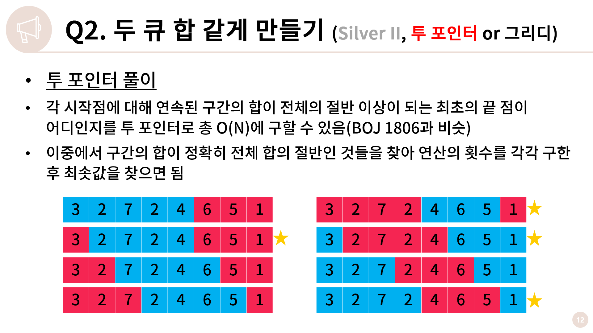 그리고 우리는 각 지점을 큐1의 시작점으로 잡았을 때 연속된 구간의 합이 전체의 절반 이상이 되는 최초의 끝 점이 어디인지를 투 포인터로 총 O(N)에 구할 수 있습니다. (BOJ 1806) 투 포인터를 모르면 제 강의를 참고해보세요. 이렇게 구간을 정해놓고 나면 앞에서 본 것과 같이 연산을 몇 번 해야하는지 계산할 수 있습니다.