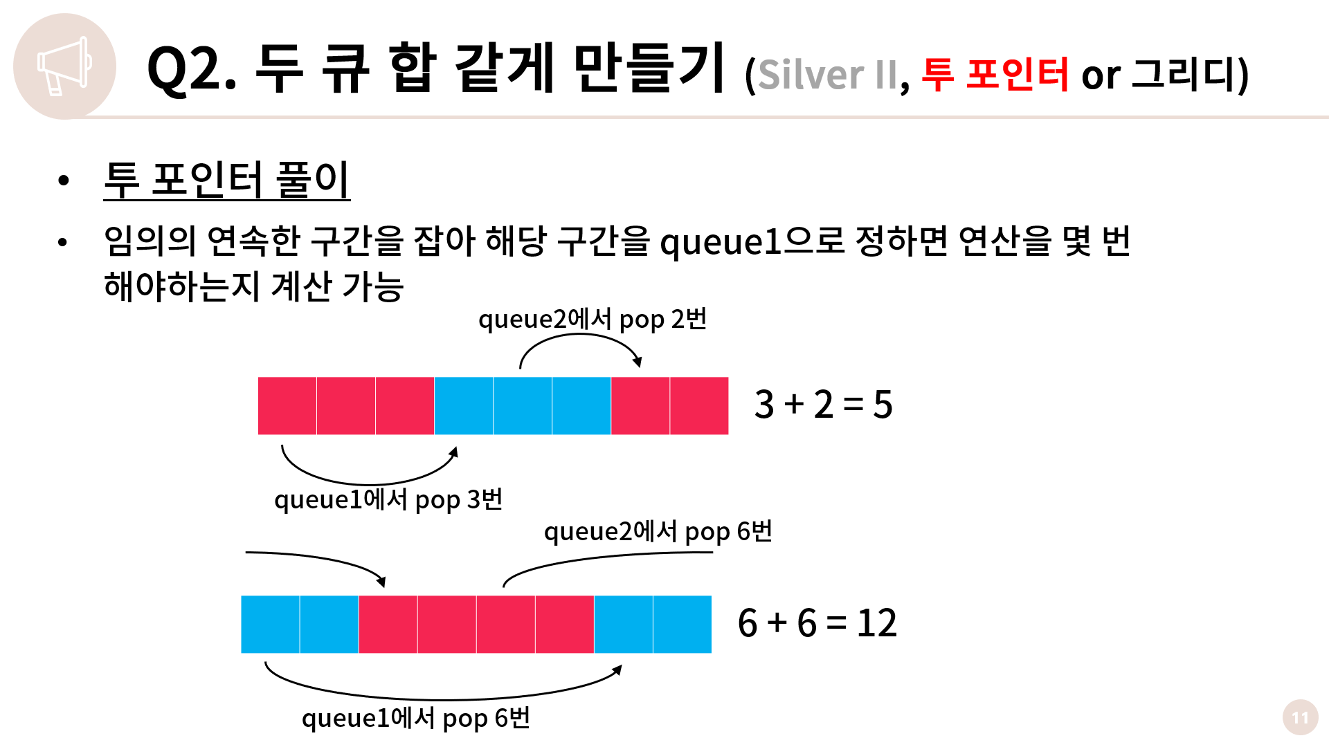 두 번째는 그리디 풀이입니다. 저는 처음 문제를 풀 당시 2번 문제부터 투 포인터가 나오는건 좀 과하다고 생각해서 고민을 거듭하다가 그리디 풀이를 떠올렸는데, 핵심은 바로 저 2가지의 관찰입니다. 첫 번째로 각 큐에서 pop을 하는 횟수가 정해지면 pop을 하는 순서와 무관하게 각 큐에 들어가는 원소가 정해집니다. 두 번째로 현재 큐1의 원소 합이 더 크면 큐1에서 pop을 1번은 해야 합니다. 이 두 가지 사실을 종합하면 현재 큐1의 원소 합이 더 크면 큐1에서 언젠가 pop을 하게 되고, 또 pop을 하는 순서는 마음대로 정하면 되니 pop을 지금 바로 하면 됨을 알 수 있습니다. 즉 원소의 합이 더 큰 큐에서 pop을 하는걸 계속 반복하면 됩니다.