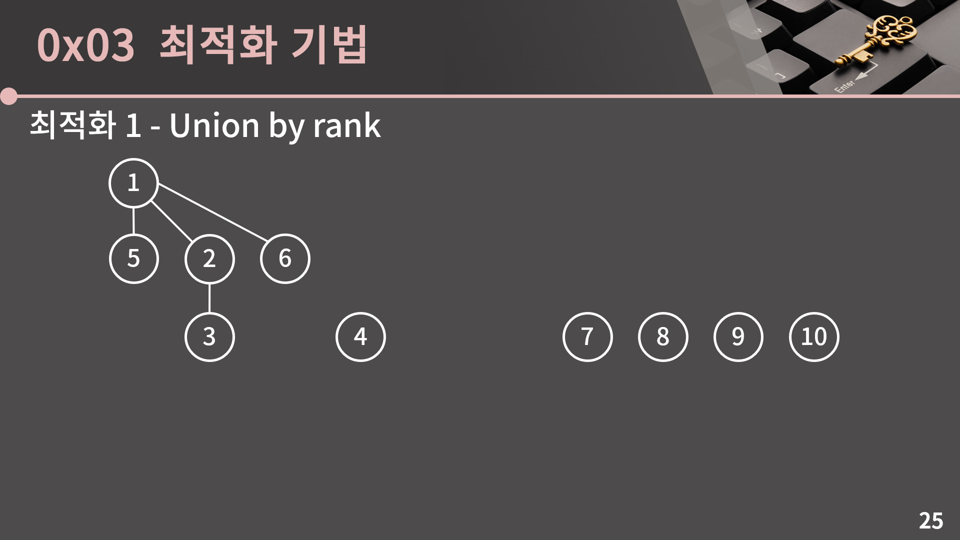 네 반갑습니다. 이번 부록 D에서는 Union-Find 자료구조를 익혀보겠습니다. 지금까지 부록 A, B, C는 크게 까다로운 것 없이 되게 무난했는데 이번 부록 내용은 원래 강의 단원에 넣기에는 좀 난이도가 있어서 뺐던 내용이라 아마 좀 어려울 수도 있습니다. 물론 그렇다고 해서 진짜 뭐 말도 안되게 어렵다거나, 한번 봐서는 이해가 힘들거다 이정도 수준은 아니기 때문에 너무 걱정은 하지 마시고 천천히 같이 익혀보겠습니다.