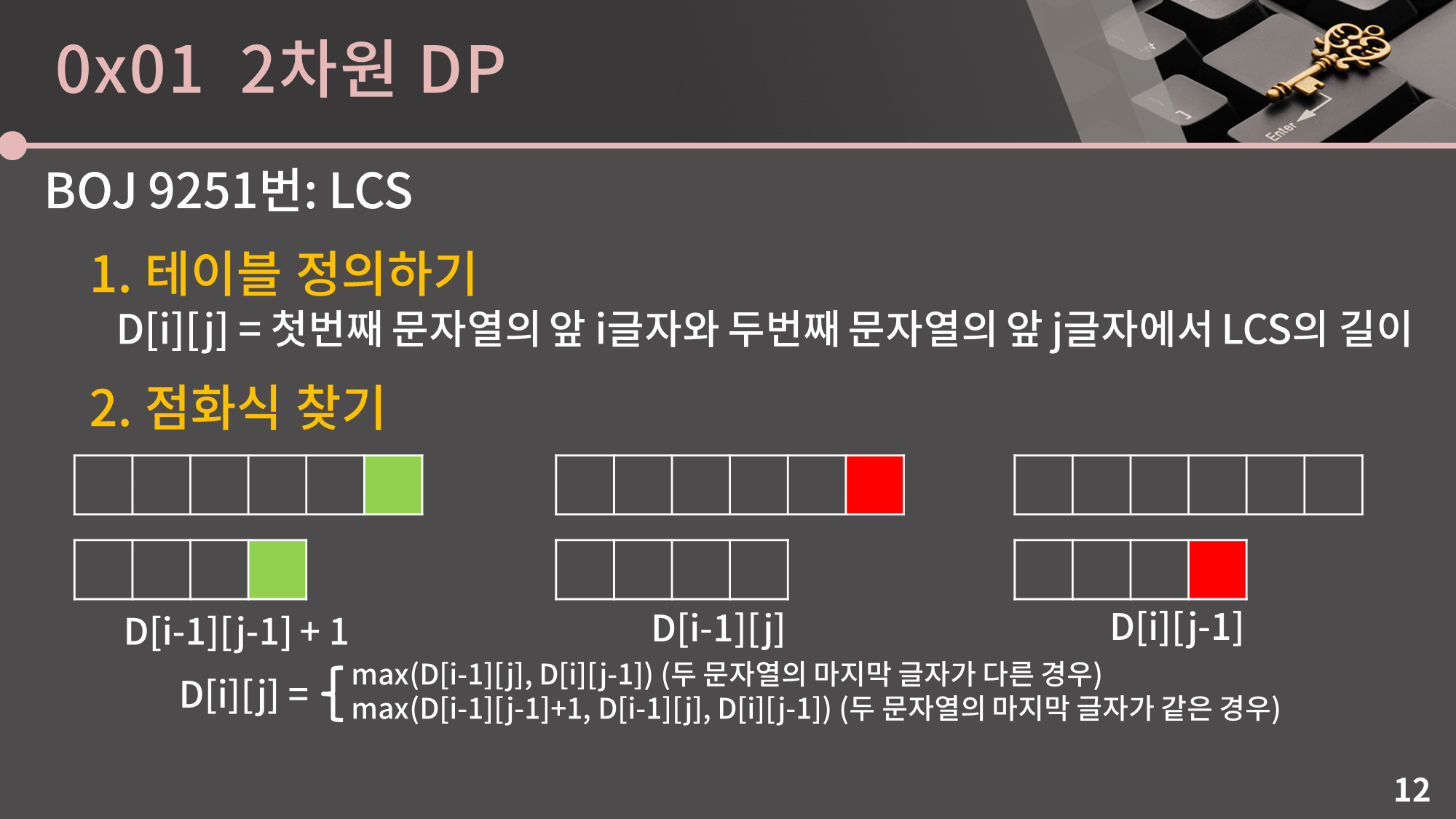 따라서 이 세 가지 경우를 나누어 보면 모든 상황을 다 처리할 수 있게 됩니다. 그리고 첫 번째 케이스는 두 문자열의 마지막 글자가 같은 경우에만 고려하면 되므로, 최종적으로 D[i][j]는 각 경우의 값 중에서 최댓값을 취하는 방식으로 계산하면 됩니다.
