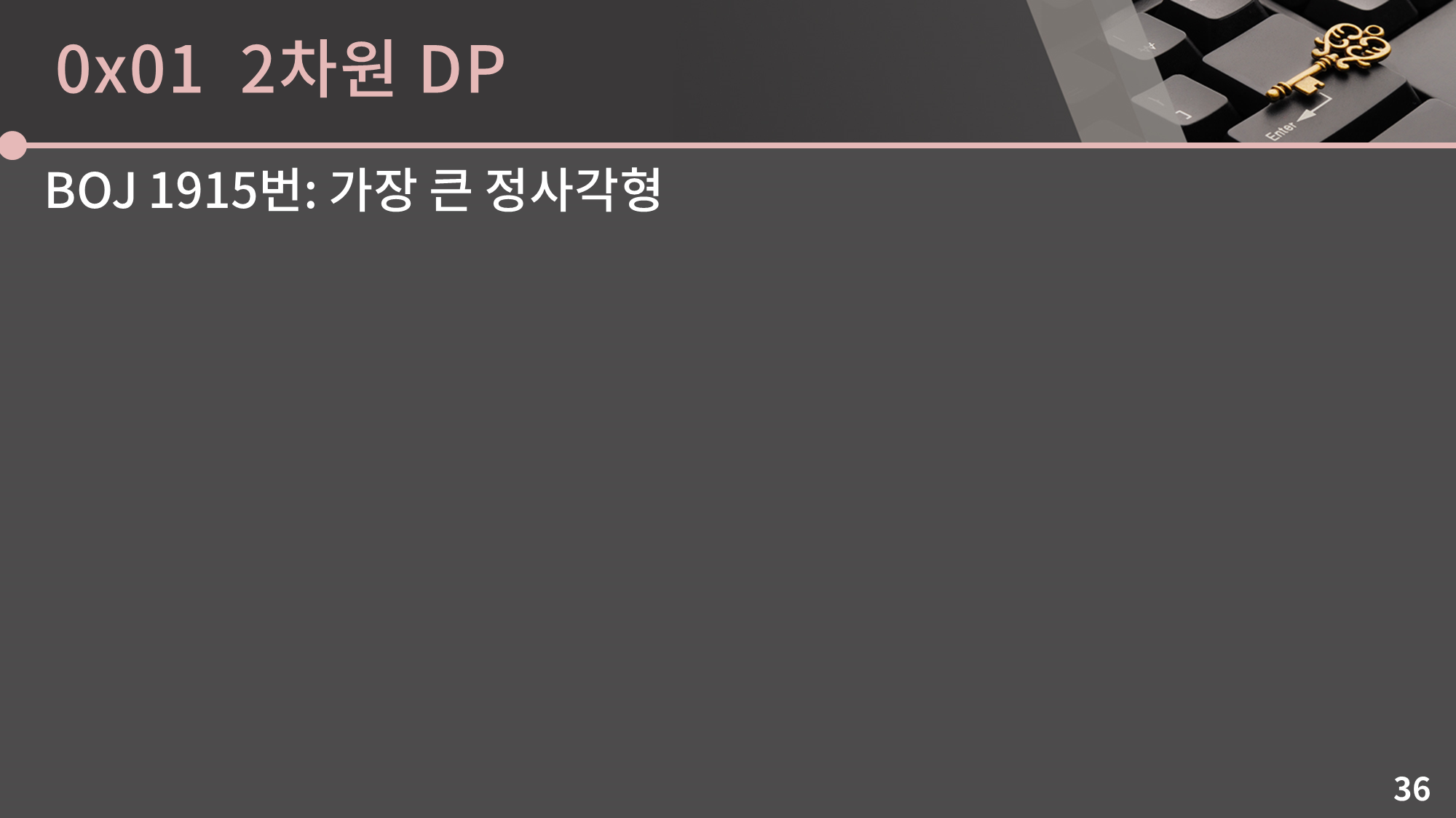 마지막으로 다룰 문제는 BOJ 1915번: 가장 큰 정사각형입니다. 이 문제는 지금까지 다룬 문제들과는 약간 다른 성격을 가지고 있어서 만약 비슷한 문제를 본 적이 없다면 풀이 방법을 쉽게 떠올리기 어려울 수 있습니다. 이 문제에서는 풀이 접근 방식에 너무 매몰될 필요가 없고 그냥 풀이를 바로 확인한 다음 비슷한 문제가 나왔을 때 비슷한 느낌으로 접근을 해야겠다 정도의 깨달음을 얻고 가면 충분합니다.