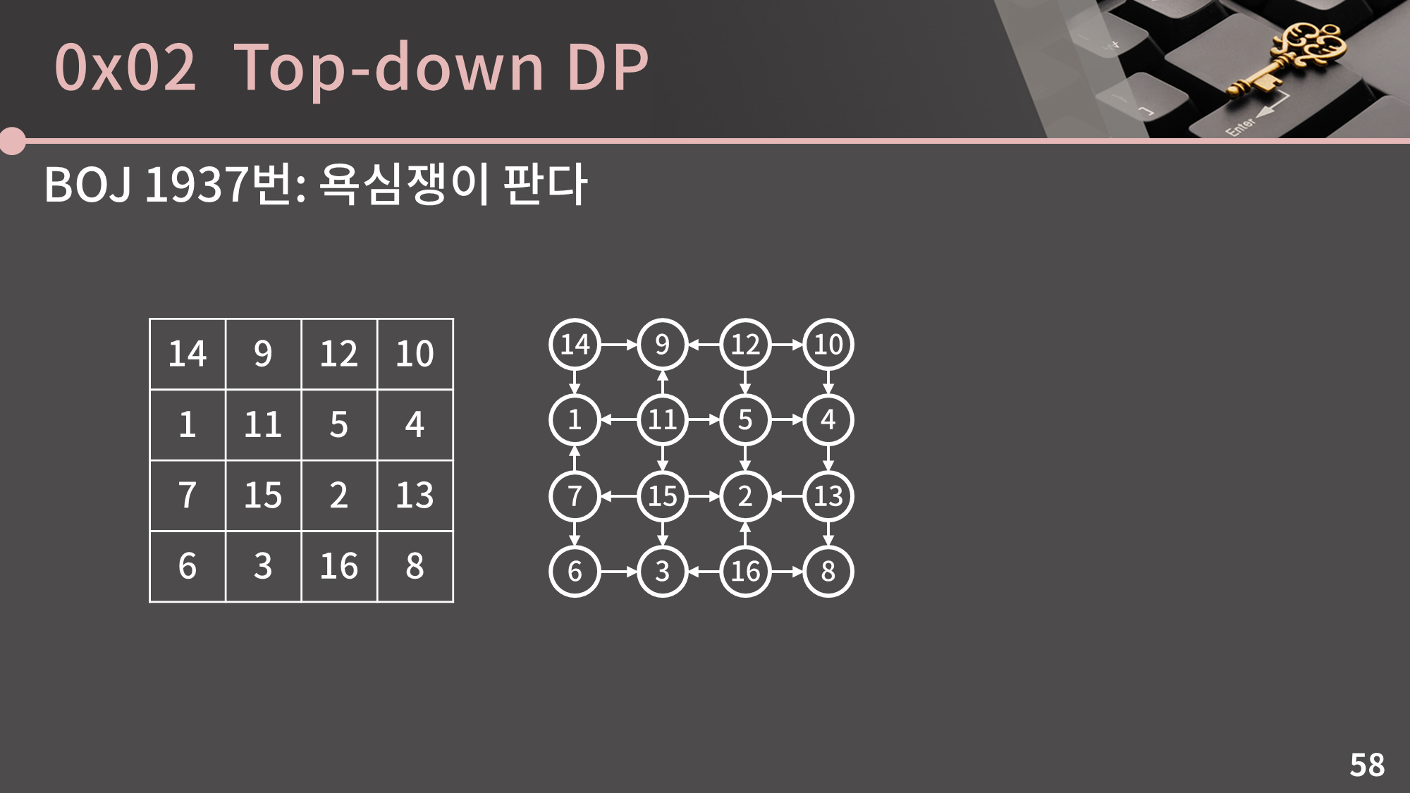 두 번째로 확인해볼 부분은, 테이블을 채우는 순서가 복잡한 경우에 대한 예시입니다. BOJ 1937번: 욕심쟁이 판다 문제를 살펴보면, 테이블의 정의나 점화식 자체는 비교적 쉽게 유추할 수 있습니다. D[i][j]를 (i, j) 칸에서 출발했을 때 이동할 수 있는 칸의 수라고 정의하면 단순히 상하좌우를 확인하면서 대나무 양이 더 많은 방향으로 이동한다고 생각하면 되니 점화식도 그 방향의 D 값에 1을 더해주는 방식으로 쉽게 구성할 수 있습니다.