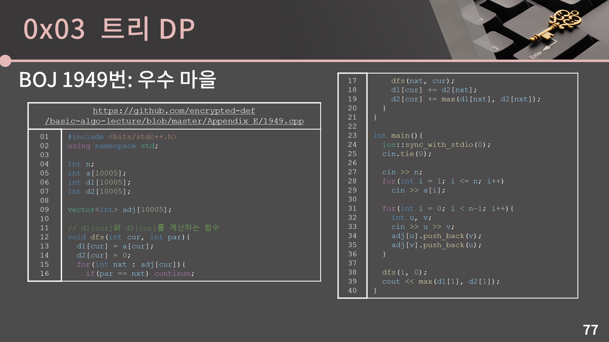 코드를 보면 참 깔끔하게 잘 짰네요. 누가 짰는지..ㅎㅎ 기본적인 흐름은 top-down DP에서 설명한 상황과 완전히 똑같습니다. adj[x]에는 x로 들어오는 정점들의 목록을 두고, go(x)에서 d[x]를 구하는데 adj[x]를 쭉 보면서 그 d 값들을 참고하면 됩니다. 그리고 10, 11번째 줄의 처리로 중복된 계산을 막아줍니다.