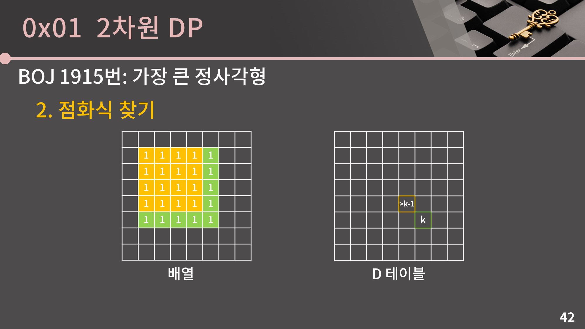 D 테이블에서 어느 칸 (i, j)의 값이 k라고 가정해봅시다. 그러면 그 칸을 오른쪽 아래 모서리로 두는 길이가 k인 정사각형이 존재한다는 뜻입니다. 즉, D[i][j]의 값은 해당 위치에서 끝나는 정사각형의 크기를 나타내는 것이죠.