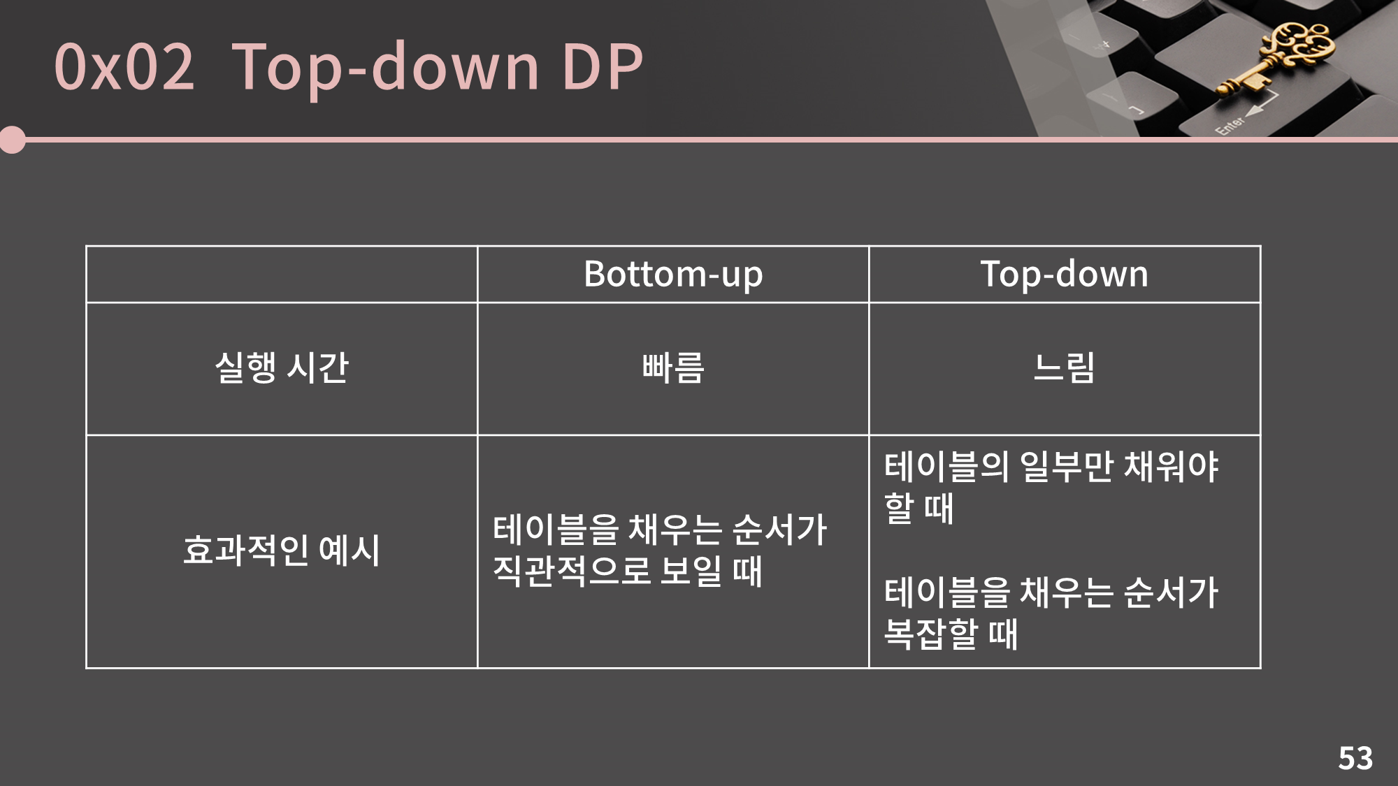 그리고 top-down 방식이 효과적인 상황은 테이블을 일부만 채워야 하거나 테이블을 채우는 순서가 복잡할 때입니다. 이러한 경우에는 top-down 방식이 더 유용할 수 있고 각각이 어떤 상황인지는 직접 문제를 풀면서 확인해보겠습니다.