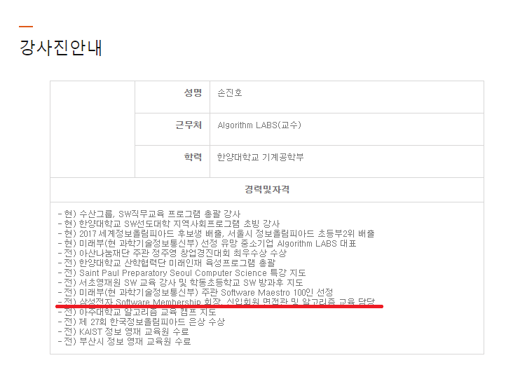 2. 국내 최고 알고리즘 전문가 집단 제작 -> 사실 이것 때문에 글을 쓰게 됐다. 절대 국내에서 최고로 알고리즘을 잘해야 이런 서비스를 제공할 수 있다는 얘기는 아니다. 꼭 알고리즘을 ICPC 월파에 나갈 정도로, 혹은 IOI 국대로 뽑힐 정도로 잘하지는 않더라도 훌륭한 강사가 될 수 있다고 생각한다. 그러나 그것과는 별개로 국내 최고 알고리즘 전문가라는 문구는 정말 거슬린다. 대표 강사진으로 소개되는 세 분 중에 한 분은 KOI 금상과 ICPC 대전 리저널 5등이라는 굉장히 훌륭한 실력을 가지고 계셨지만 나머지 두 분은 객관적으로 국내 최고라고 주장하기엔 좀 많이 부족하다.