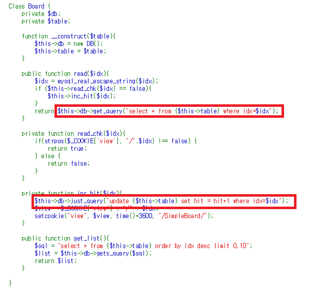 idx를 인자로 받아 쿼리를 처리할 때 mysql_real_escape_string이라는 필터링만 있어 SQL Injection이 쉽게 가능함을 확인할 수 있습니다. 그런데 실제로 1 order by 1 -- 이라는 쿼리를 보내보면 query error라고 뜹니다. 이는 첫 번째 빨간 네모친 부분에서는 아무런 문제가 없지만 2번째, 쿠키 값을 가지고 hit을 증가시키기 위한 부분에서 오류가 발생했기 때문입니다.(UPDATE에 order by를 사용할 수 없습니다.)