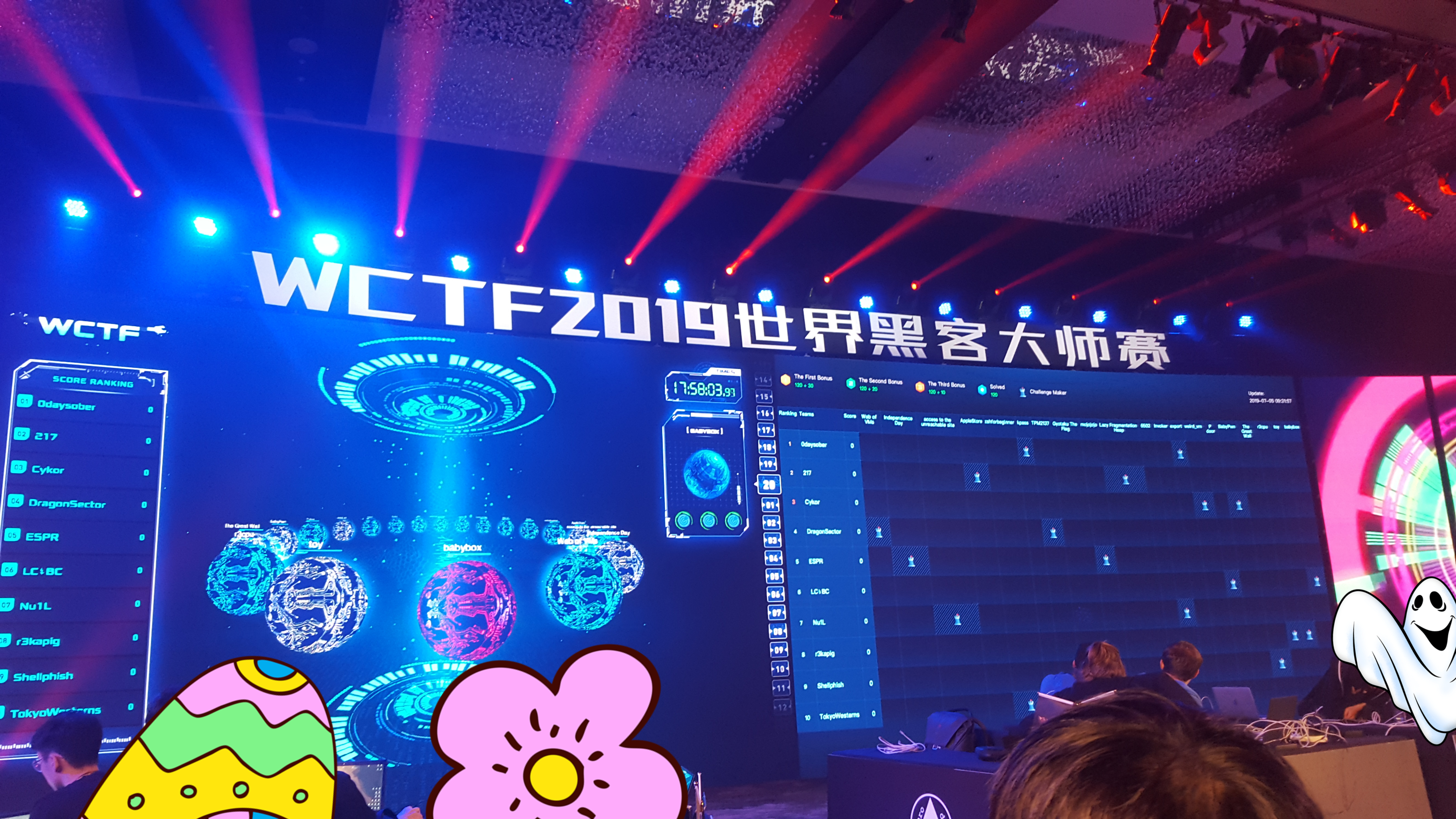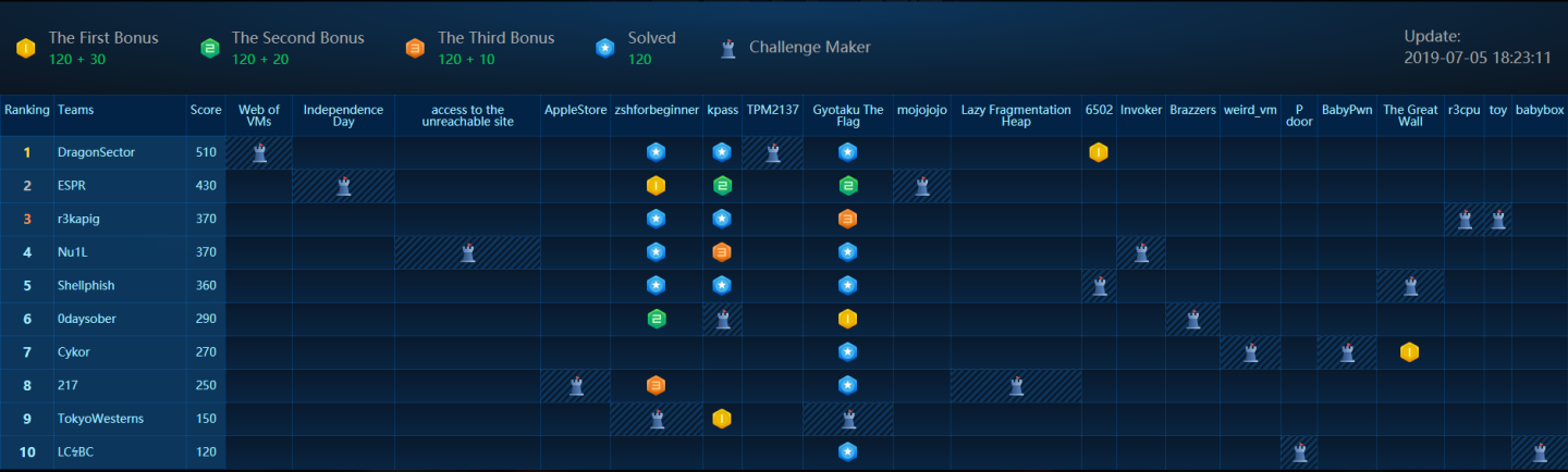 그러나 정작 TokyoWesterns들이 출제한 두 문제 zshforbeginner, Gyotaku The Flag 모두 의도하지 않은, 말도 안되게 간단한 취약점이 있어서 1일차에는 kpass, zshforbeginner, Gyotaku The Flag만 주구장창 풀렸습니다. 저희 팀은 zshforbeginner, kpass를 첫 날 풀어내지는 못했지만 jinmo123님이 The Great Wall이라는 문제를 쓱싹해버리셨습니다.
