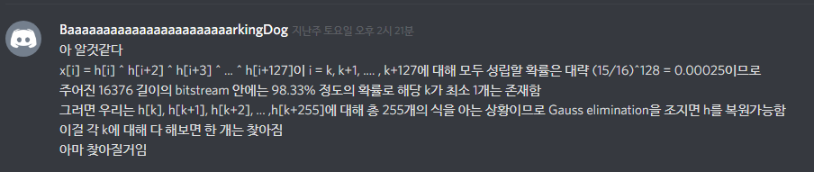 여기서 파일로 주어진 16376bit의 stream을 만들어내는 초기값 inp를 찾으면 그것이 바로 flag였고 0xB64E4D3FA8E7331BD871FA30D46D4DBA이라는 LFSR의 다항식은 딱히 문제가 없어보였습니다. 새벽 4시쯤 포팅한 코드를 받아 문제가 요구하는 바를 알아차린 이후, 9시간 가까이 굉장히 고통받았습니다. 당연히 안되겠지만 z3 solver에 넣어보기도 하고 simulated annealing 코드를 짜보기도 하고 이런저런 삽질을 하다가, 대회 종료를 5시간 앞두고 갑자기 깨달음을 얻었습니다. 설명은 제 채팅으로 대신합니다.