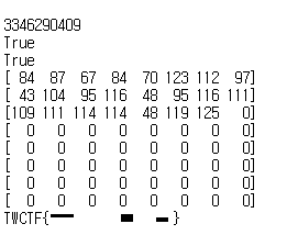 OTP_A = M([[2716582022, 4084301418, 4151818525, 1422278892, 1369861164, 1613298264, 2900073187, 1964598128], [2753481205, 493595652, 565315225, 2950028936, 1494654641, 1565198195, 1821935145, 1185861501], [164370357, 436005162, 2815701498, 4174156708, 256795861, 3977759784, 1246234692, 97057022], [2325621496, 2620744676, 4018666671, 251117397, 3819917537, 1321497732, 896265439, 3639242790], [983542825, 4020044468, 1958580572, 595003756, 3013143078, 3706886809, 1979749517, 3687361750], [2611731788, 1782804165, 2927906200, 1928514011, 3906629325, 1280809420, 3698151597, 2378812419], [243836322, 3754526163, 3532682755, 2108443022, 354737559, 2625058601, 3107811435, 2905858194], [3218114692, 2694084275, 827772422, 1556237123, 291488027, 621169480, 653426521, 510118975]])