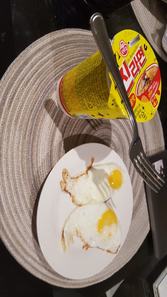 바로 다음날 새벽 6시에 그랜드캐니언 1박 2일 투어 픽업이 숙소 앞에 오기로 예정되어있었기 때문에 일찍 자려고 했지만 시차 때문에 그게 잘 안됐고 새벽 4시쯤 깼습니다. 집에서는 요리를 해 먹는 게 그렇게 귀찮더니 밖에 나오니 갑자기 요리가 하고 싶어 져 계란 프라이와 컵라면 하나로 가볍게 아침을 해결했습니다.
