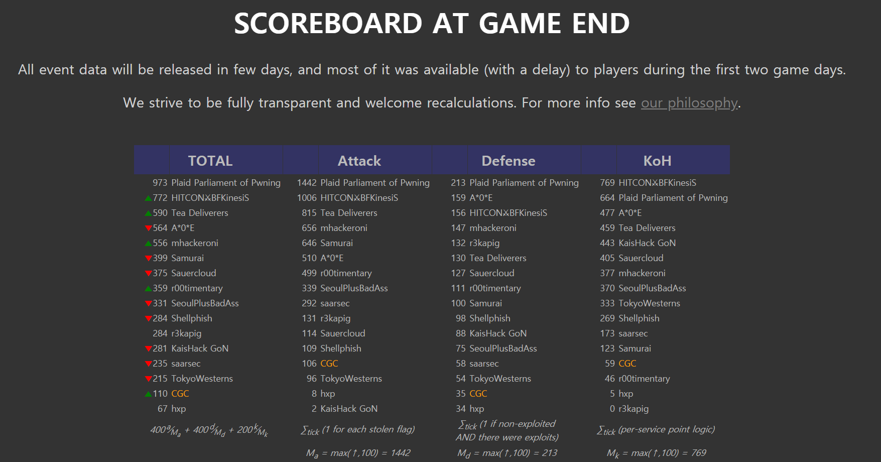 저희 팀은 CodeRed, GYG와 연합을 해서 팀 CGC로 예선을 치렀고 예선 때 암호 문제를 붙잡긴 했지만 썩 문제를 잘 해결하지는 못했습니다. 역시 잠을 잘 자는 게 중요한 것 같아요. 본선은 Attack & Defense 형식이고 지금까지의 경향을 볼 때 딱히 저의 지식이 도움이 될 것 같지는 않아 본선에 참여할지 말지 고민을 좀 많이 했습니다. ICPC 준비를 하는 게 마음에 좀 걸리기도 했고요.