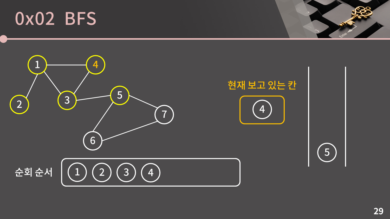 큐가 비어있지 않으므로 큐의 front인 5번 정점을 꺼냅니다.