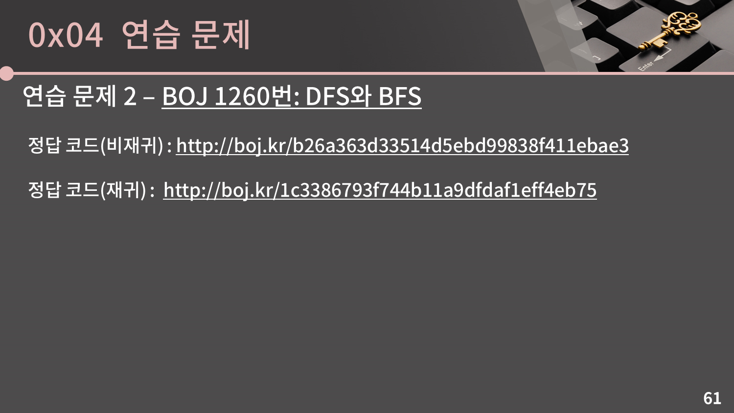 혹시 이전 슬라이드와 이번 슬라이드에서 다루는 내용이 잘 이해가지 않는다면 그냥 본인에게 편한 비재귀 방식 하나만을 익혀두고 넘어가셔도 상관없습니다. DFS의 고유한 성질을 사용해서 해결해야 하는 문제는 cycle detection, scc, bcc, Eulerian trail 등과 같이 코딩테스트에서는 나올 확률이 0에 수렴하는 어려운 문제들이기 때문입니다.