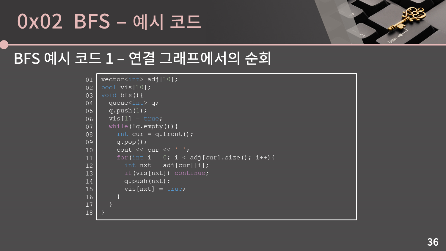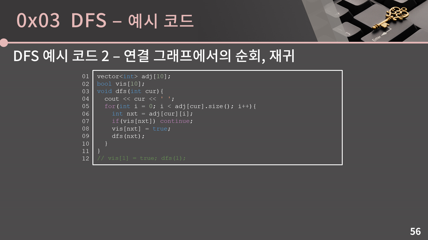만약 C++11이 지원되는 환경이라면 for문에서 i를 0부터 adj[cur].size까지 증가시키는 대신 for(auto nxt : adj[cur]) 로 타이핑을 덜 낭비하고 구현할 수 있습니다.