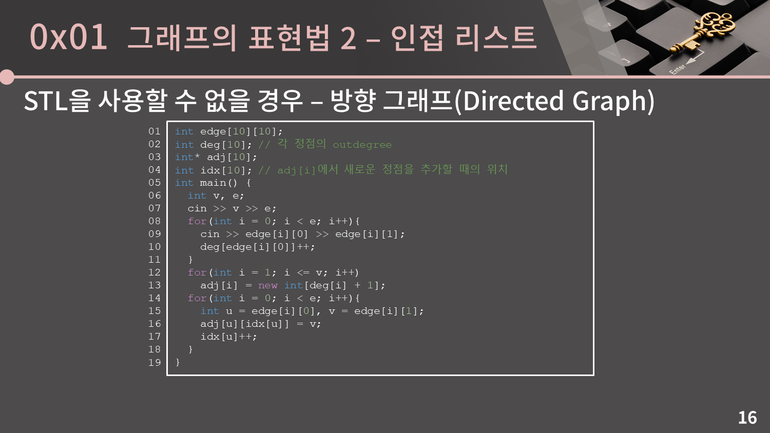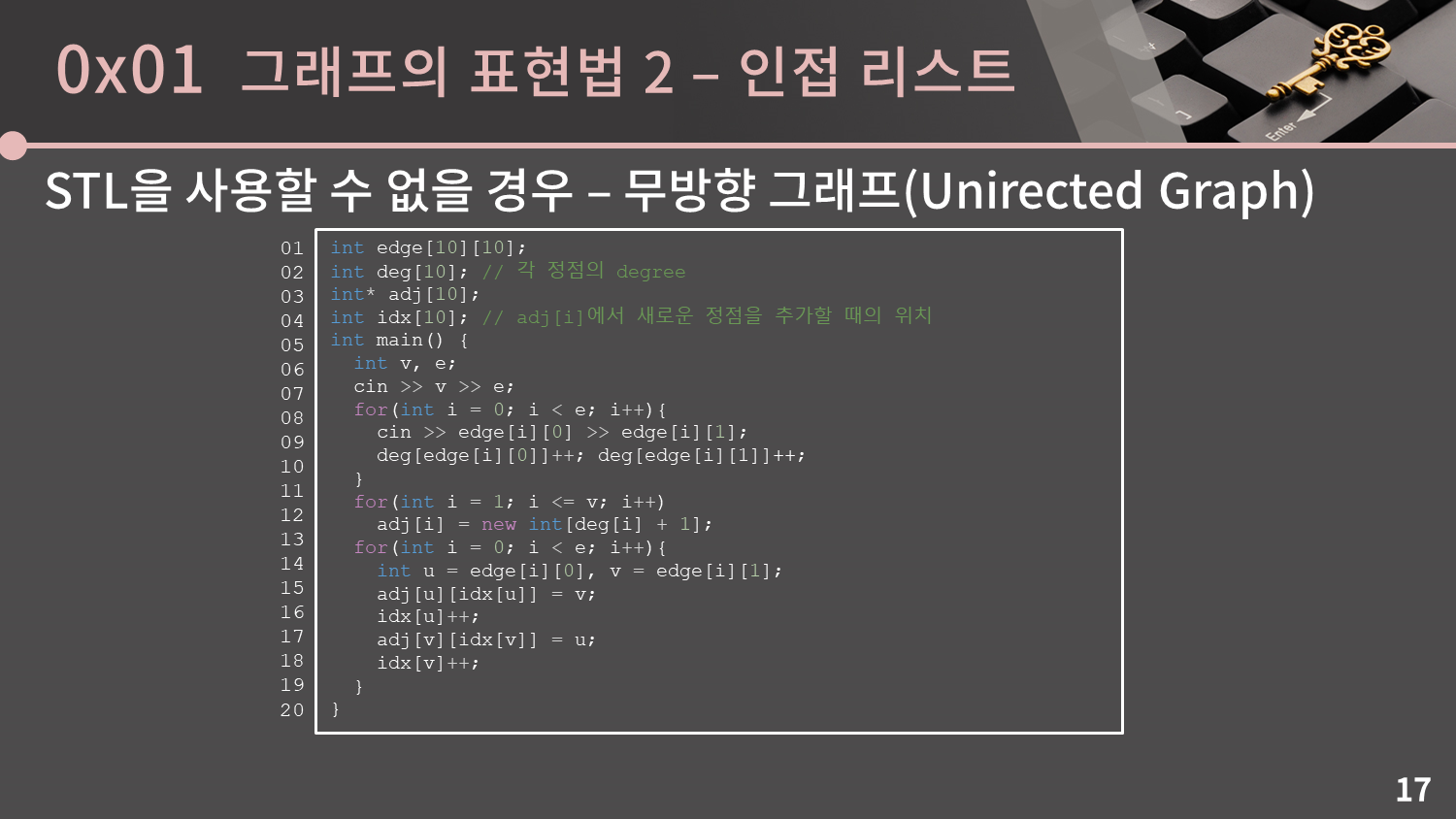 adj[i]에 동적 할당을 할 때 deg[i]에 1을 더한 크기로 할당을 받는 까닭은 차수가 0일 때 new int[0]; 으로 0칸짜리 배열을 할당받는 것이 다소 꺼림직하게 느껴져서입니다. 1을 더하는 처리가 없어도 상관은 없습니다.