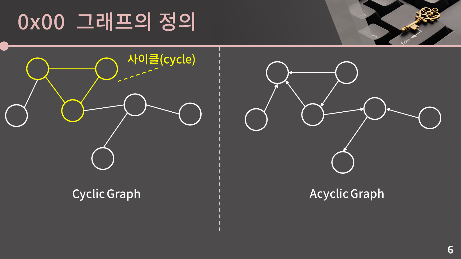 임의의 한 점에서 출발해 자기 자신으로 돌아올 수 있는 경로를 사이클이라고 부릅니다. 그래프 내에 사이클이 존재하면 해당 그래프는 Cyclic Graph라고 부릅니다. 반대로 사이클이 존재하지 않는 그래프는 Acyclic Graph입니다. 오른쪽의 경우 얼핏 보면 왼쪽과 같이 사이클이 있는 것 처럼 보이나 간선의 방향성으로 인해 사이클에 존재하지 않음에 유의하세요.