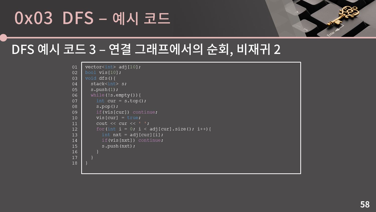 방문할 수 있는 정점이 여러 개인 경우에는 정점 번호가 작은 것을 먼저 방문한다는 조건을 맞추기 위해 adj를 정렬하는 과정이 추가로 들어가있습니다. 이외에는 위에서 썼던 코드를 그대로 활용하면 됩니다. 비재귀 버전과 재귀 버전의 코드를 다 두었으니 정답 코드를 확인해보시고 또 직접 구현해보세요. (정답 코드 - 비재귀, 정답 코드 - 재귀)