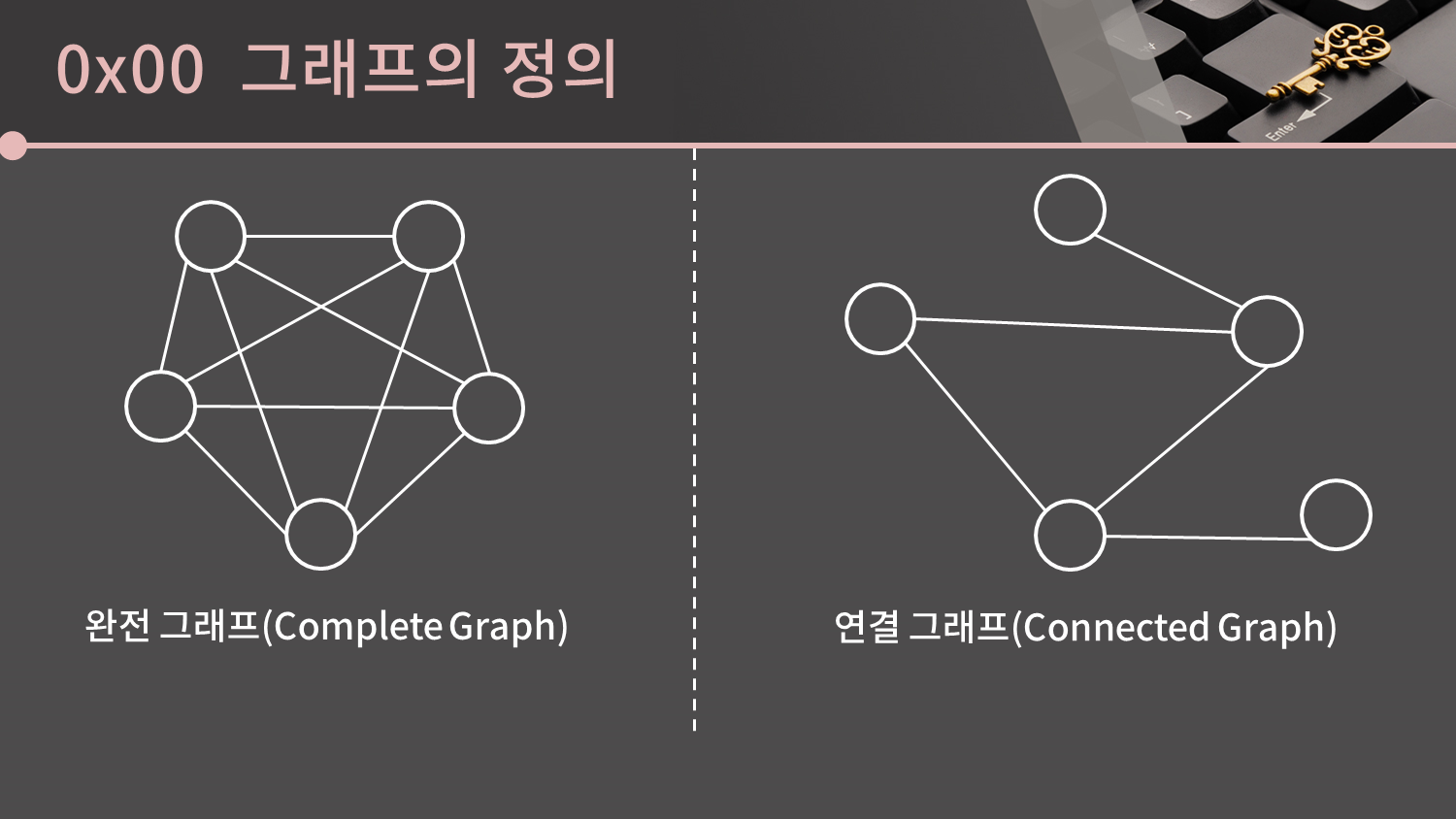 또한 모든 서로 다른 두 정점 쌍이 간선으로 연결된 그래프를 완전 그래프(Complete Graph)라고 부릅니다. 임의의 두 정점 사이에 경로가 존재하는 그래프는 연결 그래프(Connected Graph)라고 부릅니다.
