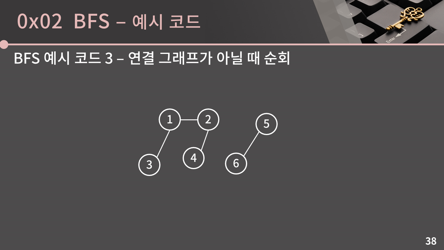 예시 코드 1은 연결 그래프가 아닐 경우 모든 정점을 방문할 수 없습니다. 예를 들어 위와 같은 그래프라면 예시 코드 1이 5번과 6번 정점을 순회하지 못하게 될 것입니다. 이를 해결하기 위해 1번만을 시작 정점으로 잡는 대신 모든 아직 방문하지 않는 정점을 시작 정점으로 잡게끔 코드를 변형하면 됩니다. 코드 예시를 확인해보세요.